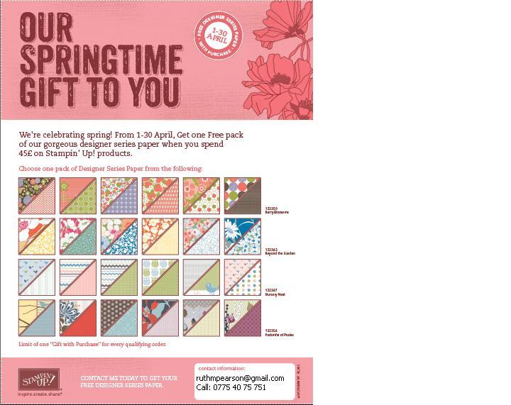 Another FREE GIFT from Stampin’ Up. From 1-30 April 2012, you can get one free pack of gorgeous Designer Series Paper when you spend £45 on Stampin’ Up! products*.