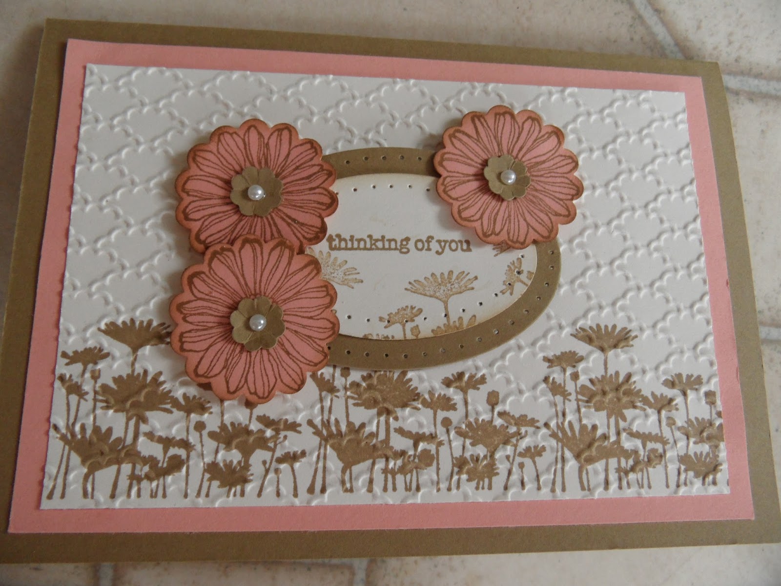 Three daisies were stamped onto crisp cantaloupe and punched out using the 1″ scallop circle and placed onto two layered ovals.