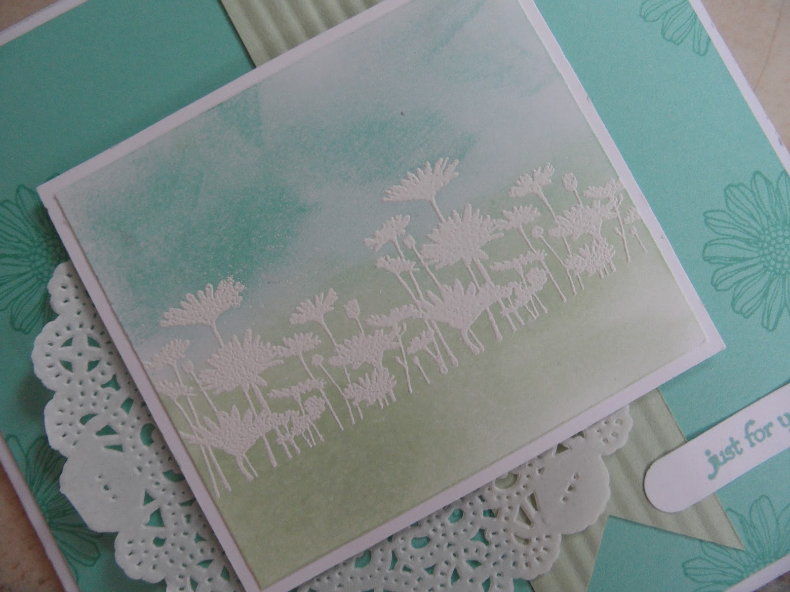 This was then sponged with coastal cabana and pistachio pudding and because the image had been heat embossed, it resists any colour put on top leaving the stamped image white