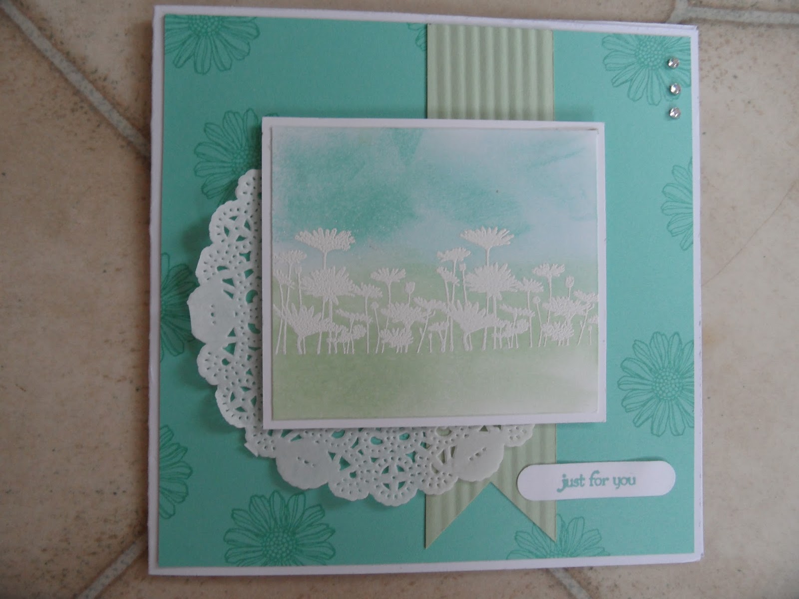 With a colour combination of pistachio pudding and coastal cabana we created the first card using the resist embossing technique. The upsy daisy stamp was inked with versamark and stamped twice onto whisper white card. We then heat embossed it with white embossing powder.