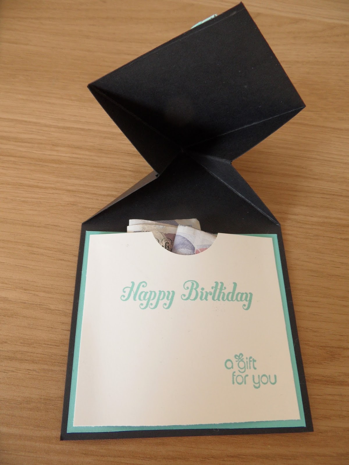 I completed it with a sentiment from ‘Bring on the cake’ stamp set and put some money in it for a perfect gift.