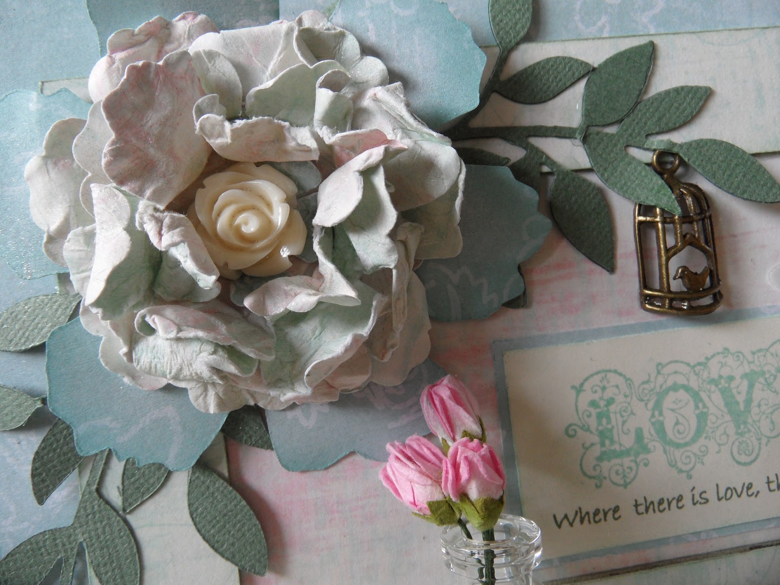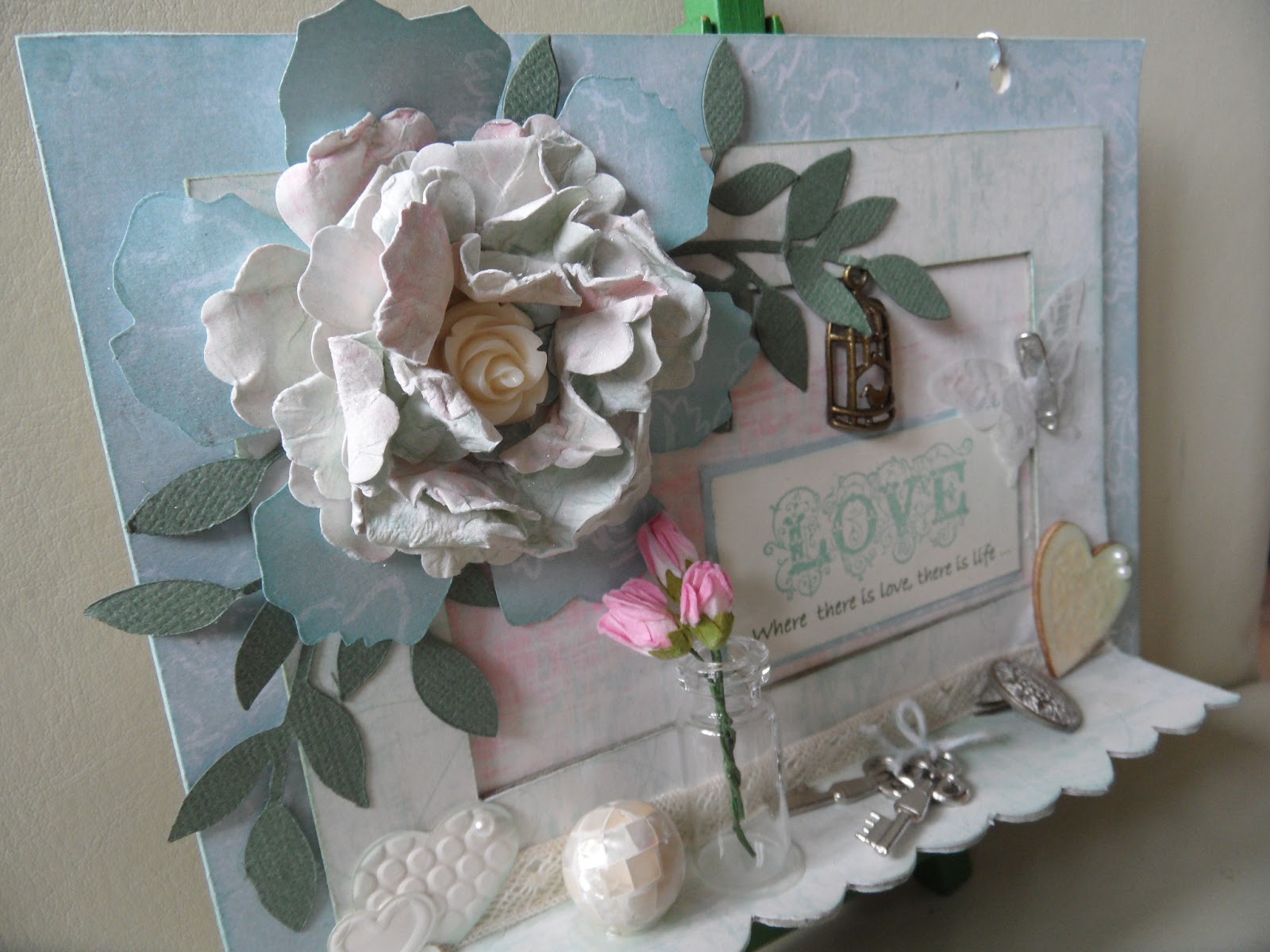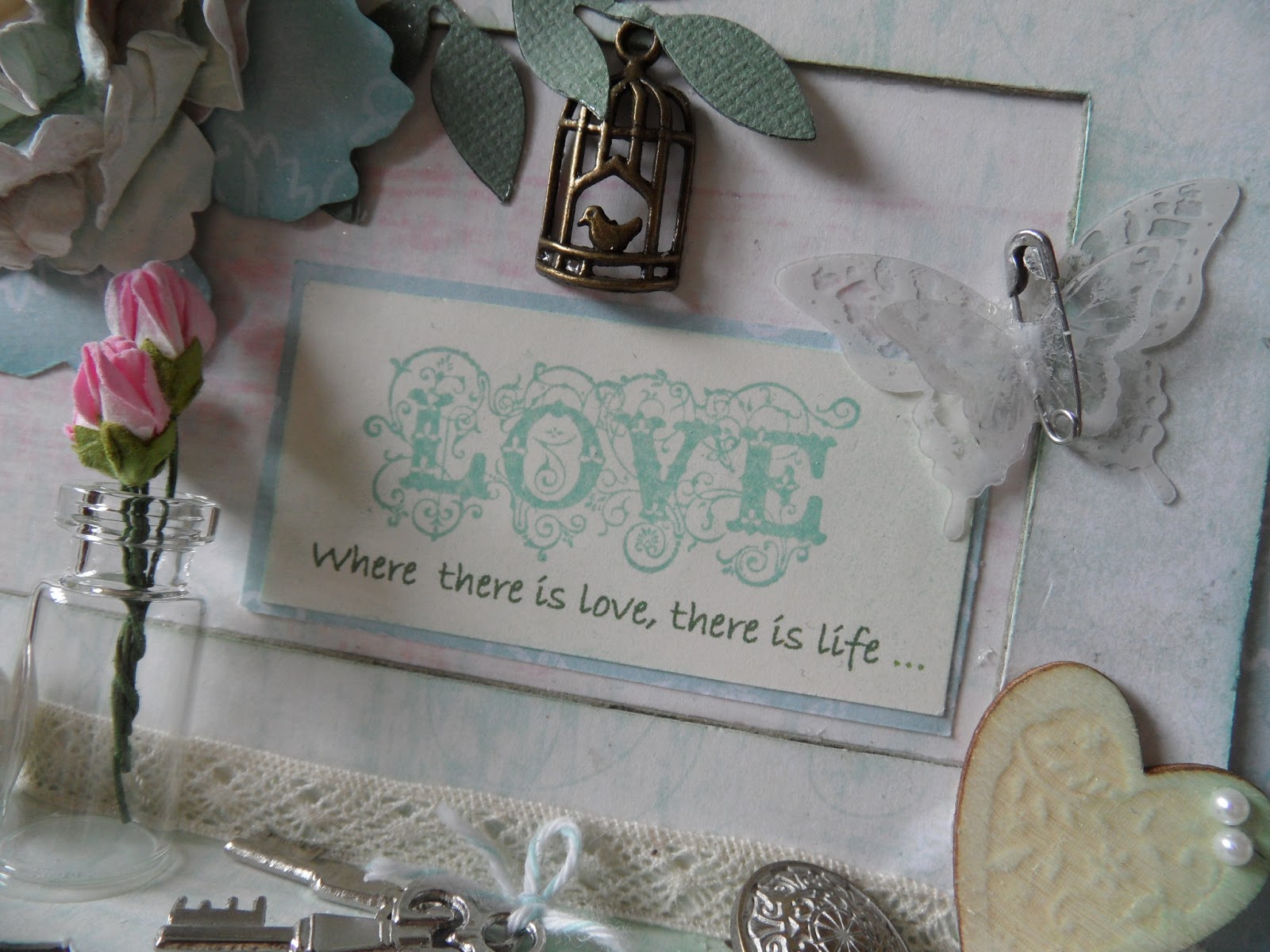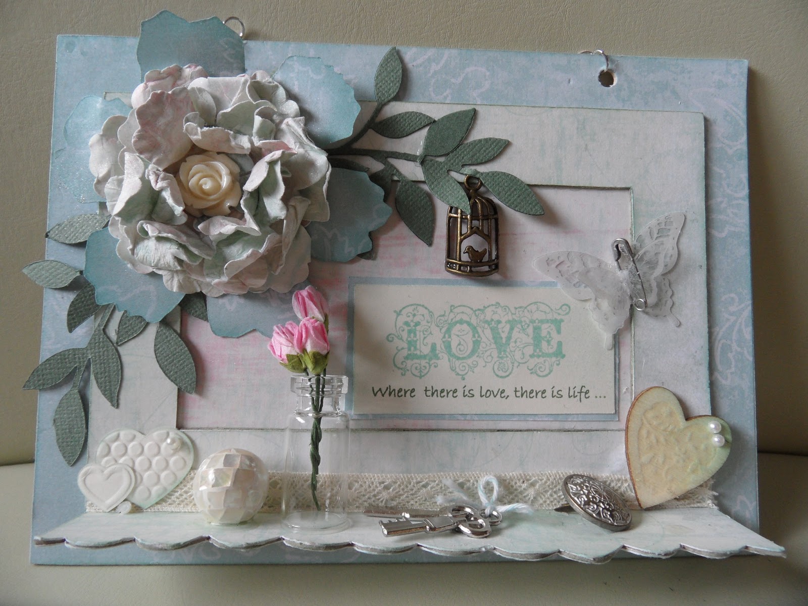 - Embellishments – Chain, wooden heart, small glass bottle, key charms, flowers, birdcage charm,cream acrylic rose – Either own supply or given by friends. Pearls, antique brads, victoria crochet trim