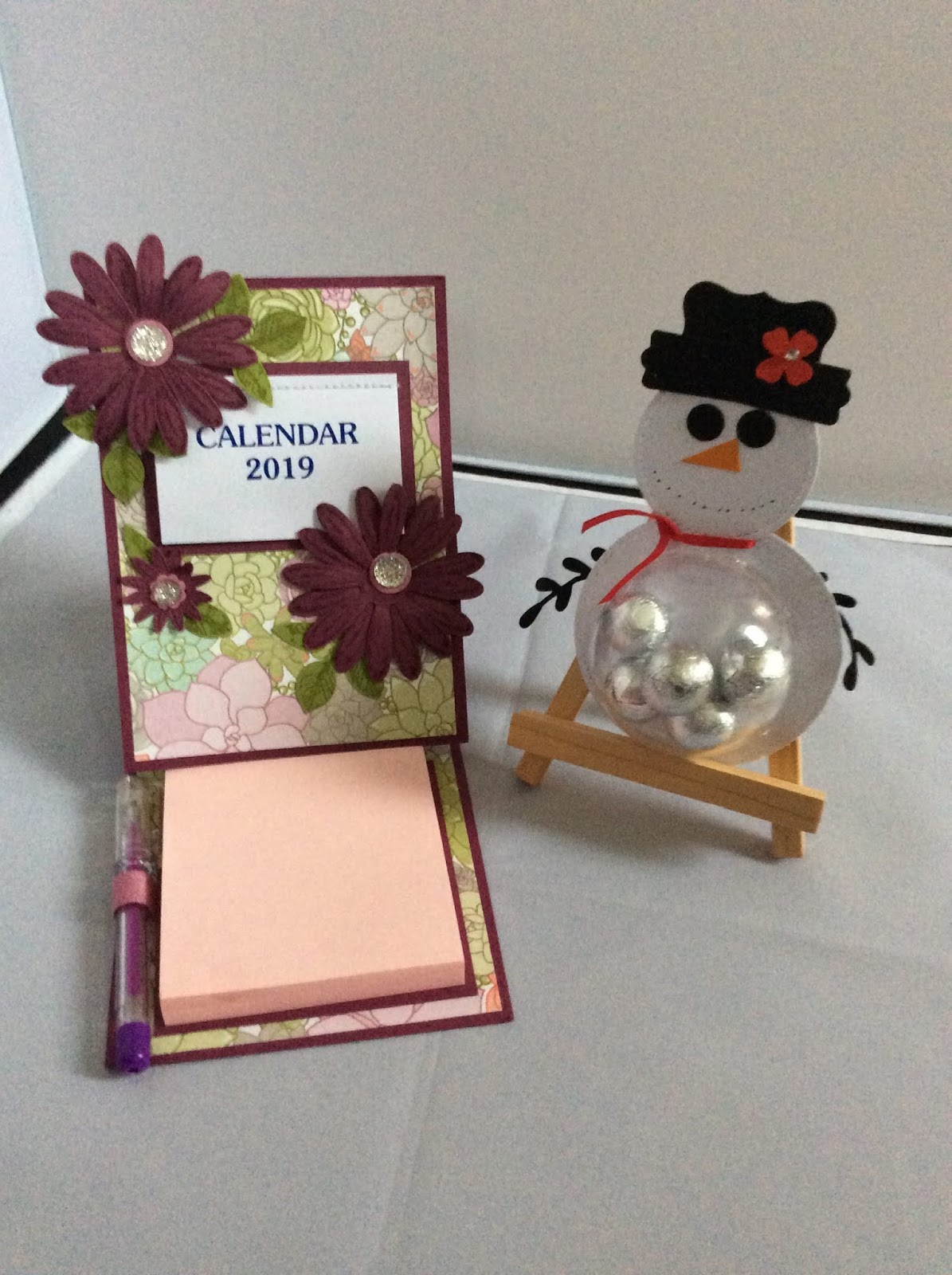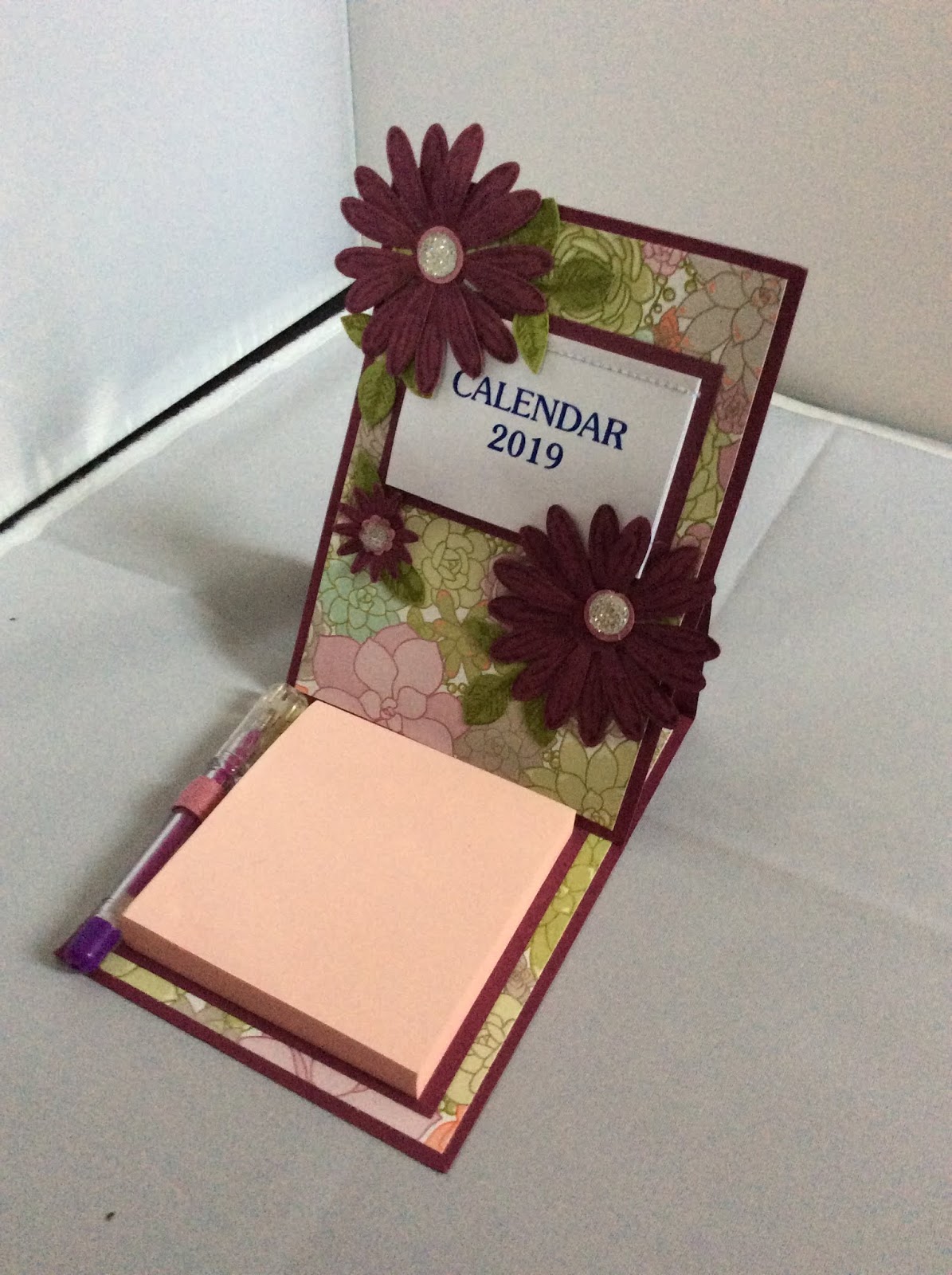 We used Rich Razzleberry cardstock as the base colour for the easel calendar and picked several different designer series papers to cordinate so there was a variety of designs to choose from. The daisy delight stamp set and punch and retired boho blossom punch were used to embellish it along with some faceted gems for the centres