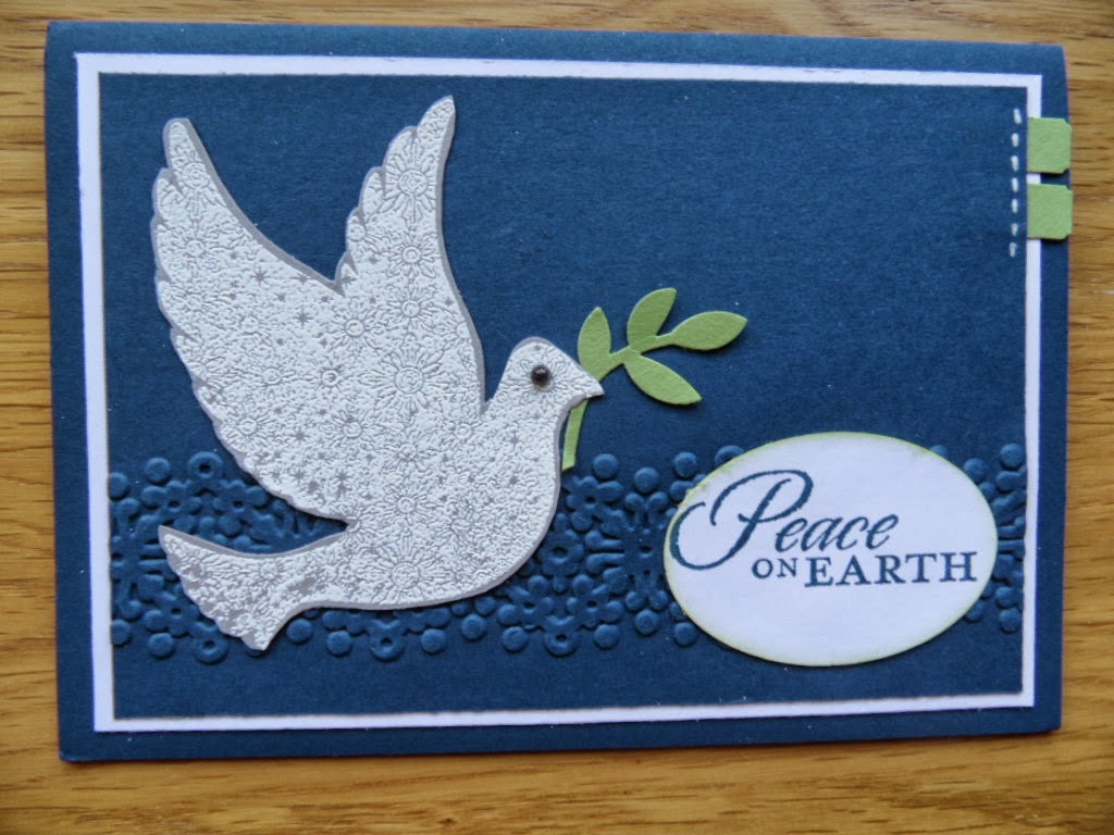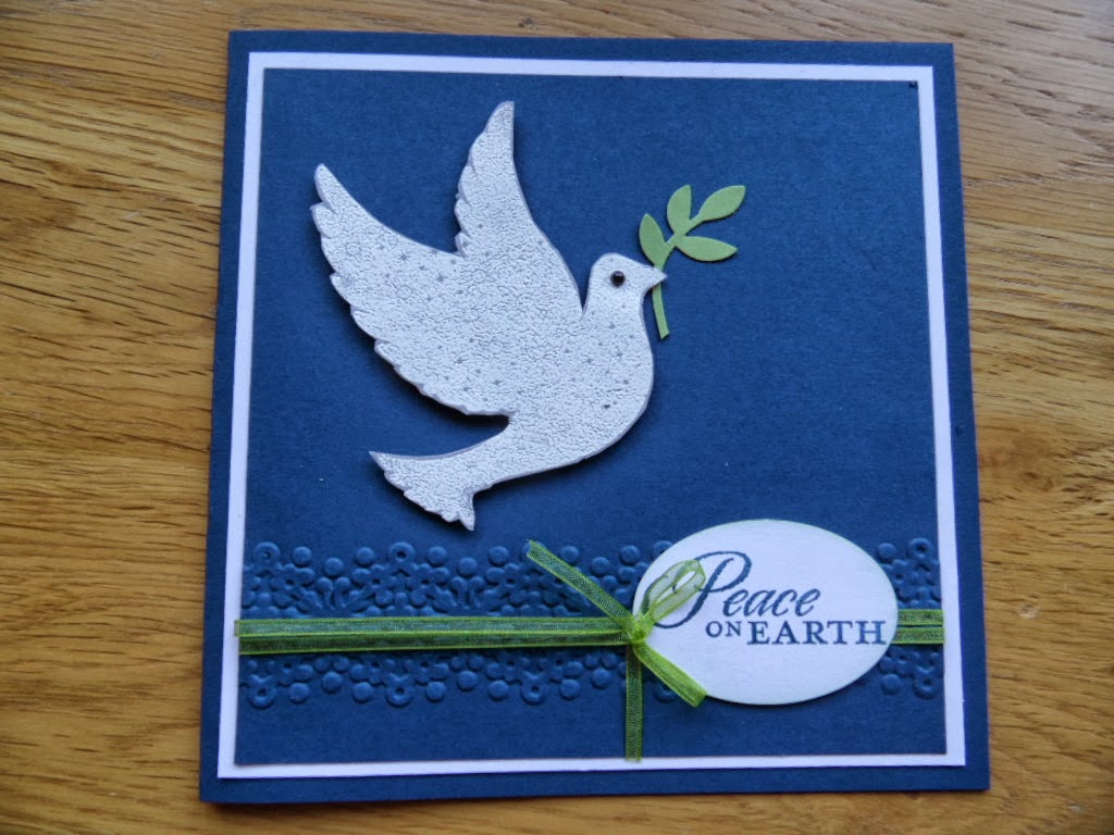 The Dove was stamped in versamark onto smoky slate cardstock, heat embossed with white powder and then the image was cut out separately and placed on dimensionals.