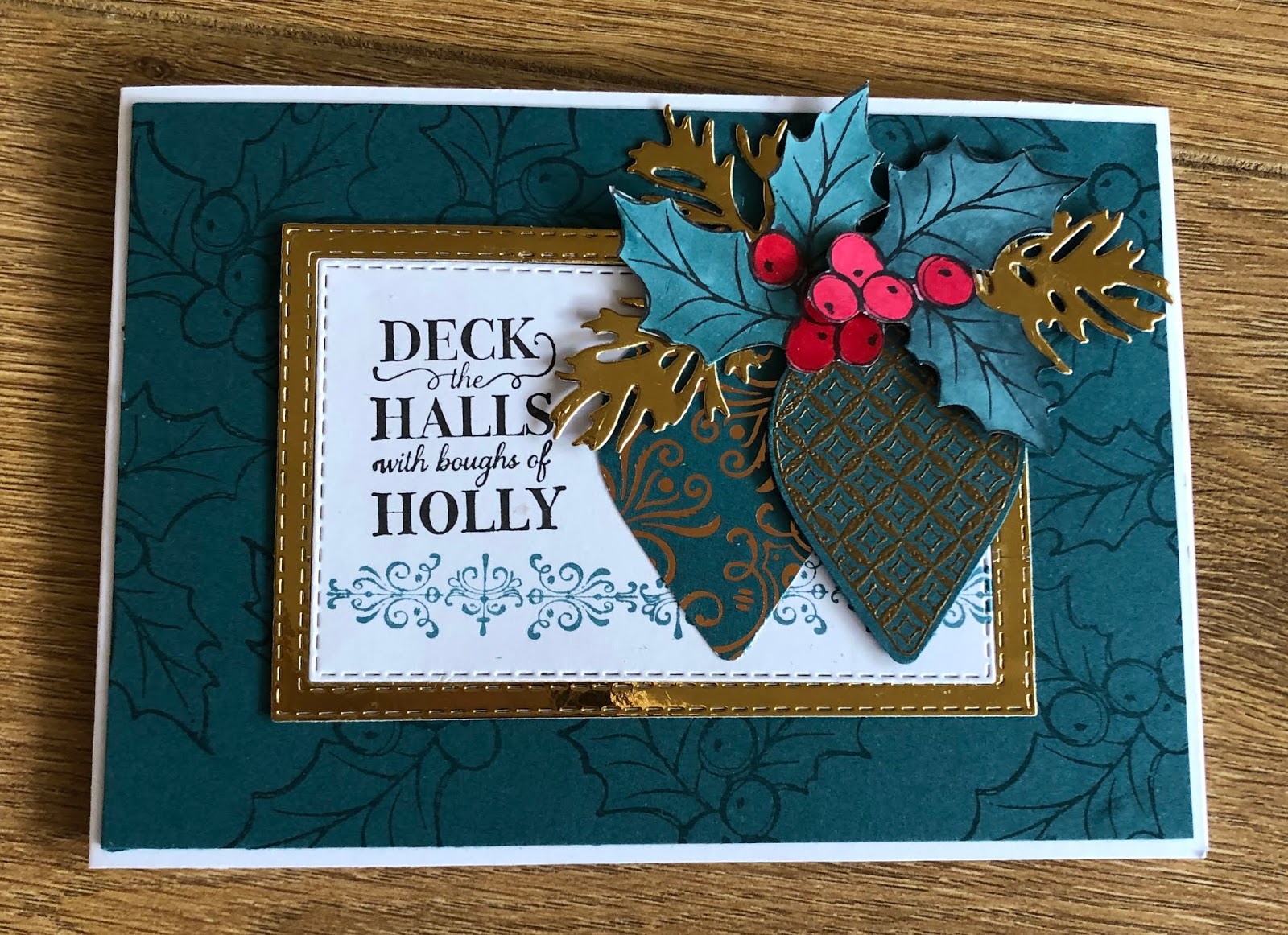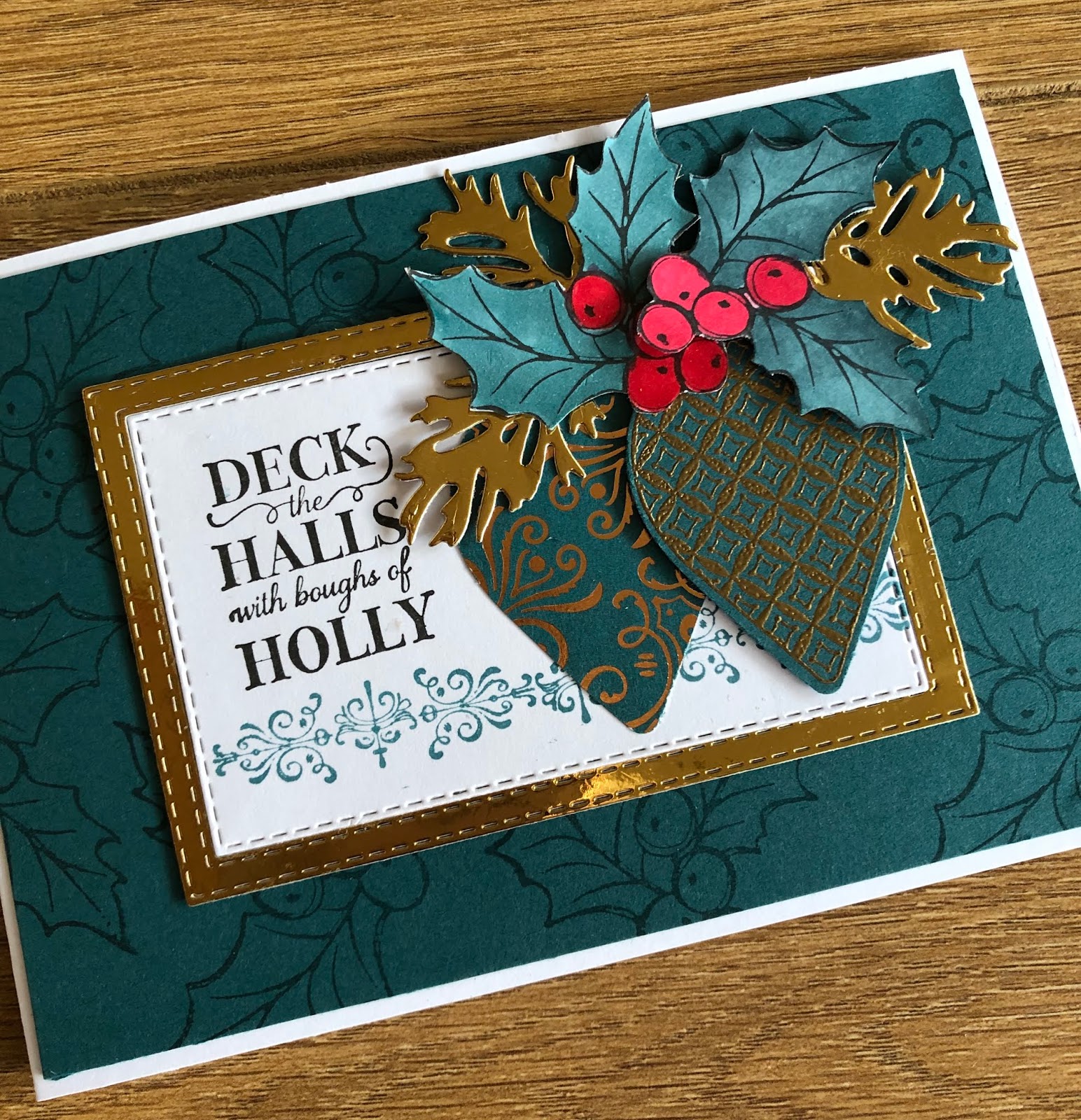 The holly leaves were coloured in using the aqua painters and Pretty Peacock ink. A beautiful card to send to anyone at Christmas