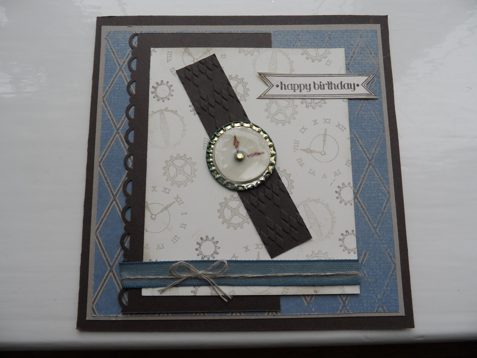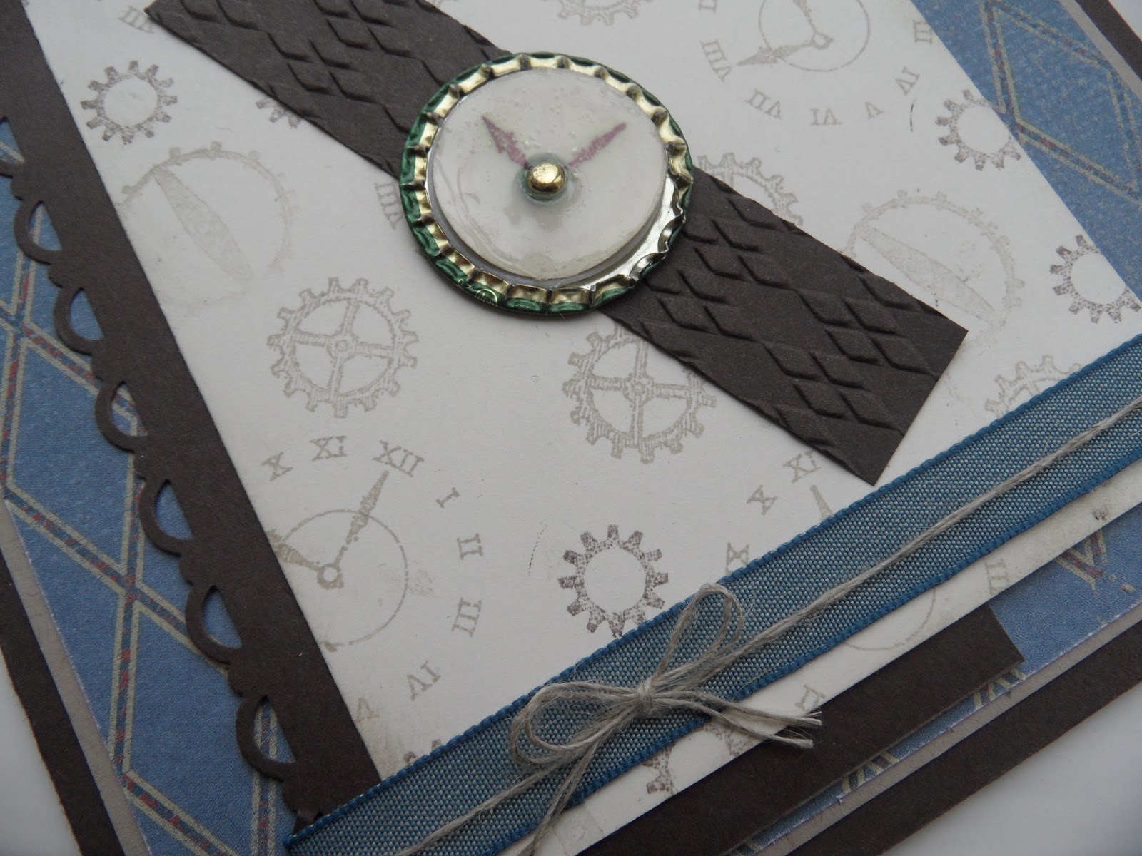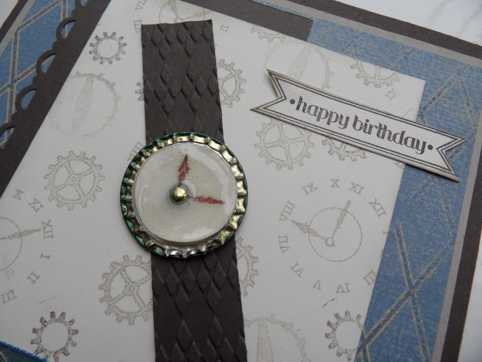 gave it to my husband (with which he was very pleased) and squashed the bottle top in the Big Shot!! for the clock face. I stamped the hands onto a 1″circle for the centre and covered it with crystal effects for the glass.