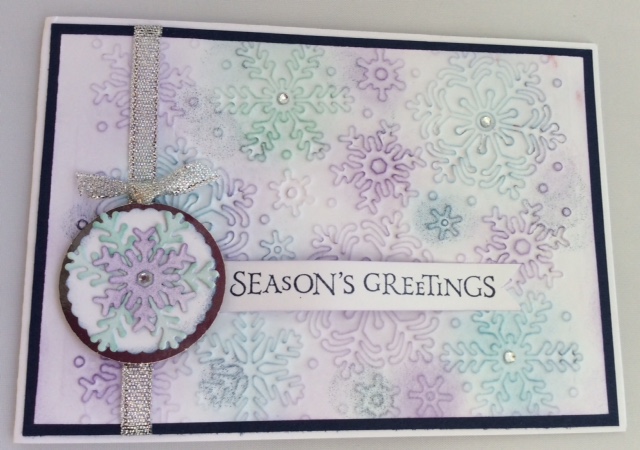 The same blizzard framelits was used as an embossing folder on the above card, instead of die cutting it,we used the Big Shot embossing mat in the die cutting machine to emboss the background and then used sponge daubers with pool party, highland heather inks to highlight the embossed snowflakes. I think the Big Shot embssing mat is a must have in your craft stash, just think of all those dies that you have that can be turned into embossed images and backgrounds!