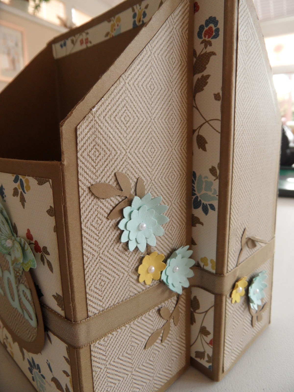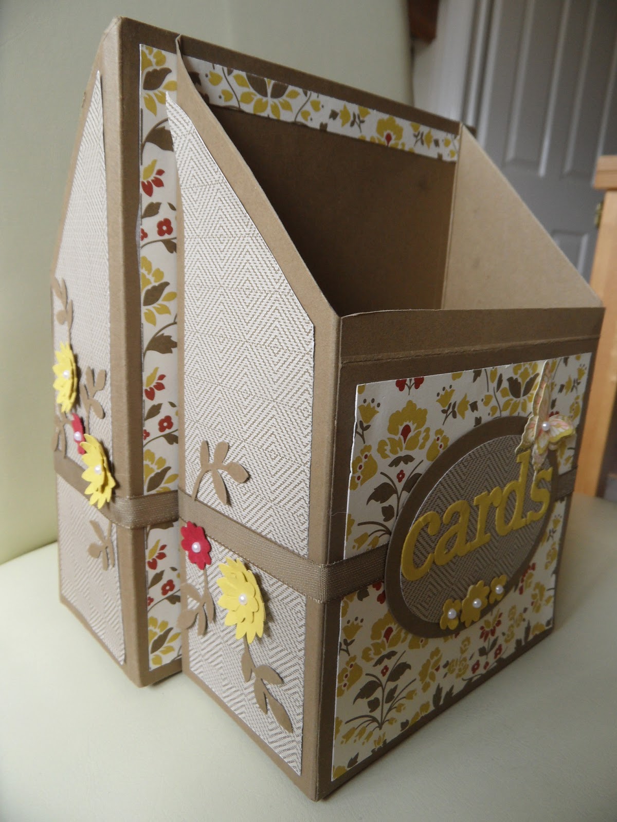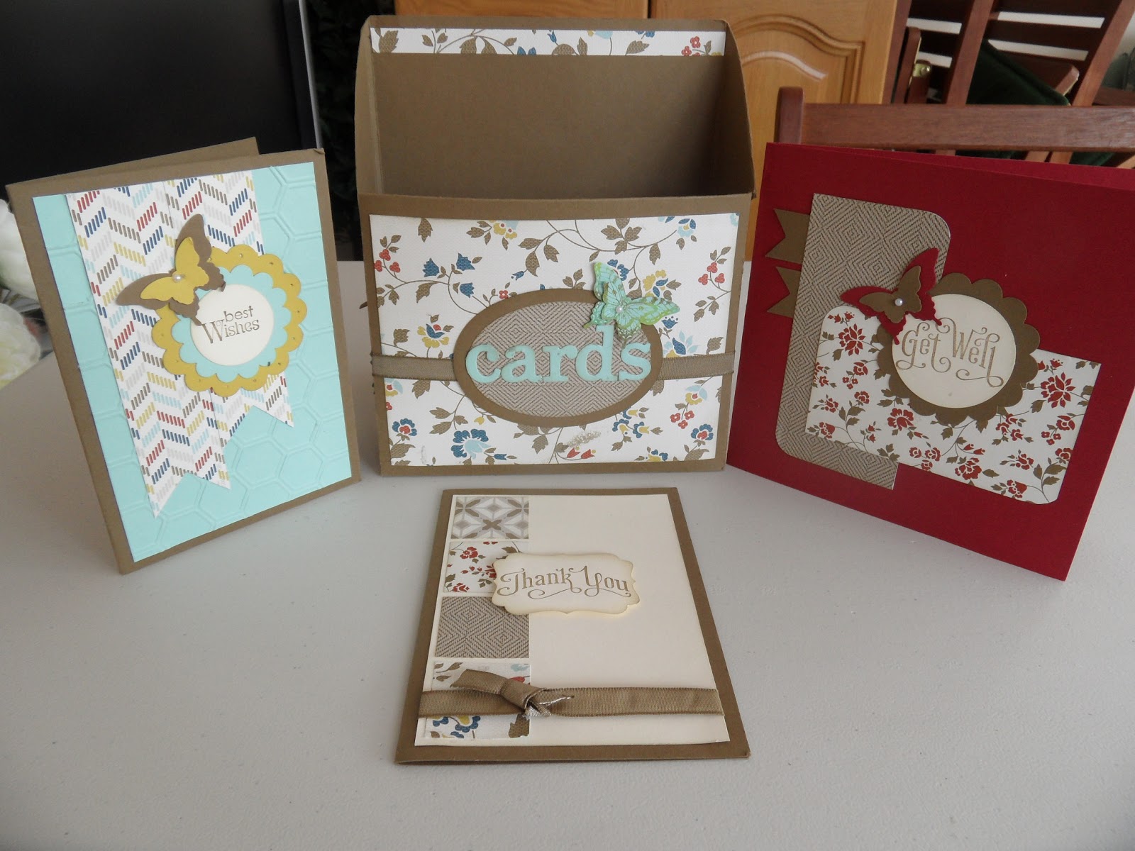 The project for our Saturday afternoon and Monday morning class was this double sided card keeper box with three cards. I first saw the idea on the internet to make the smaller box. I adapted the measurements to make the larger box so it could hold square cards as well.