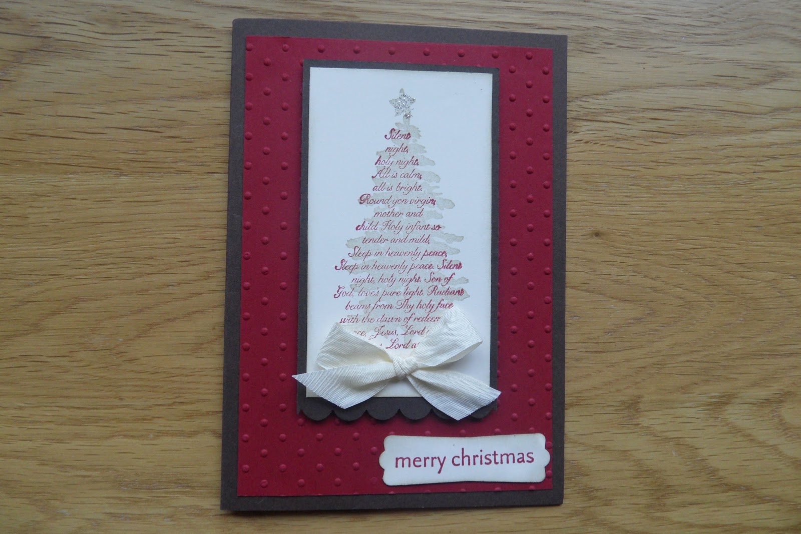 The third card uses early expresso as the main card with a layer of cherry cobbler embossed with perfect polka dots. The christmas tree was stamped in crumb cake on to very vanilla card and the words were stamped over the top with cherry cobbler ink, this was layered onto early expresso card and the bottom was trimmed with the scallop edge border punch. The bow is tied from a length of very vanilla seam binding.