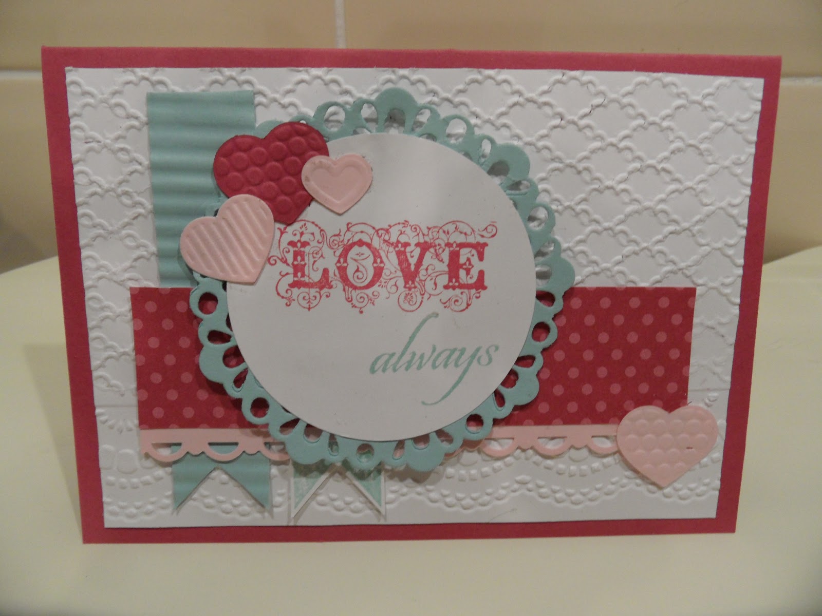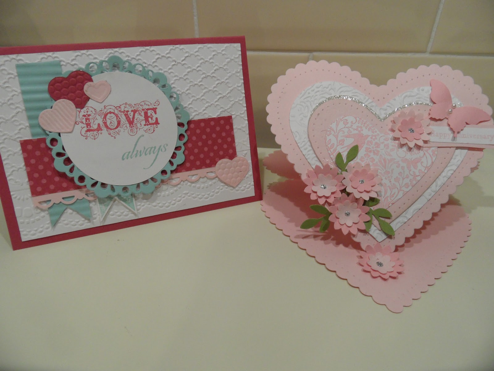 We used the hearts collection framelits to cut out some pink pirouette card to make the heart easel card. Various layers in pink pirouette and whisper white were cut and either embossed with vintage wallpaper folder or stamped and heat embossed using the heart from the You are Loved stamp set