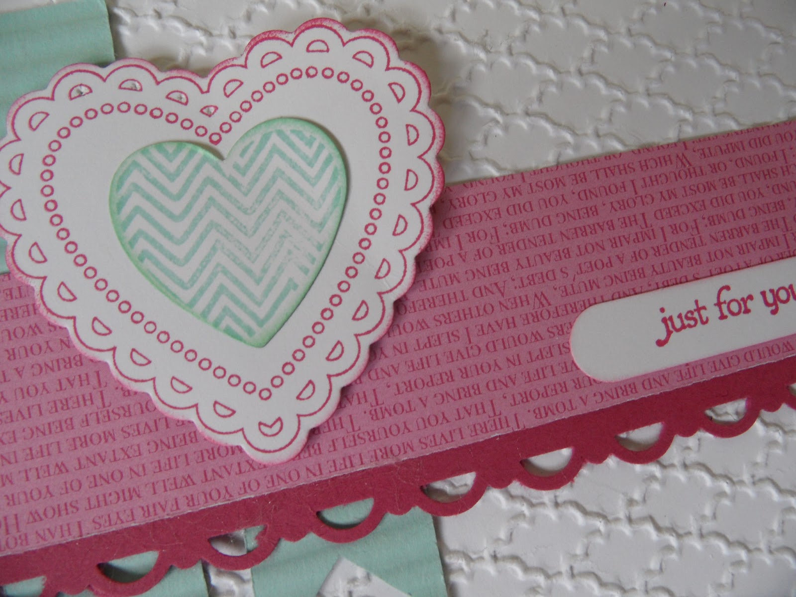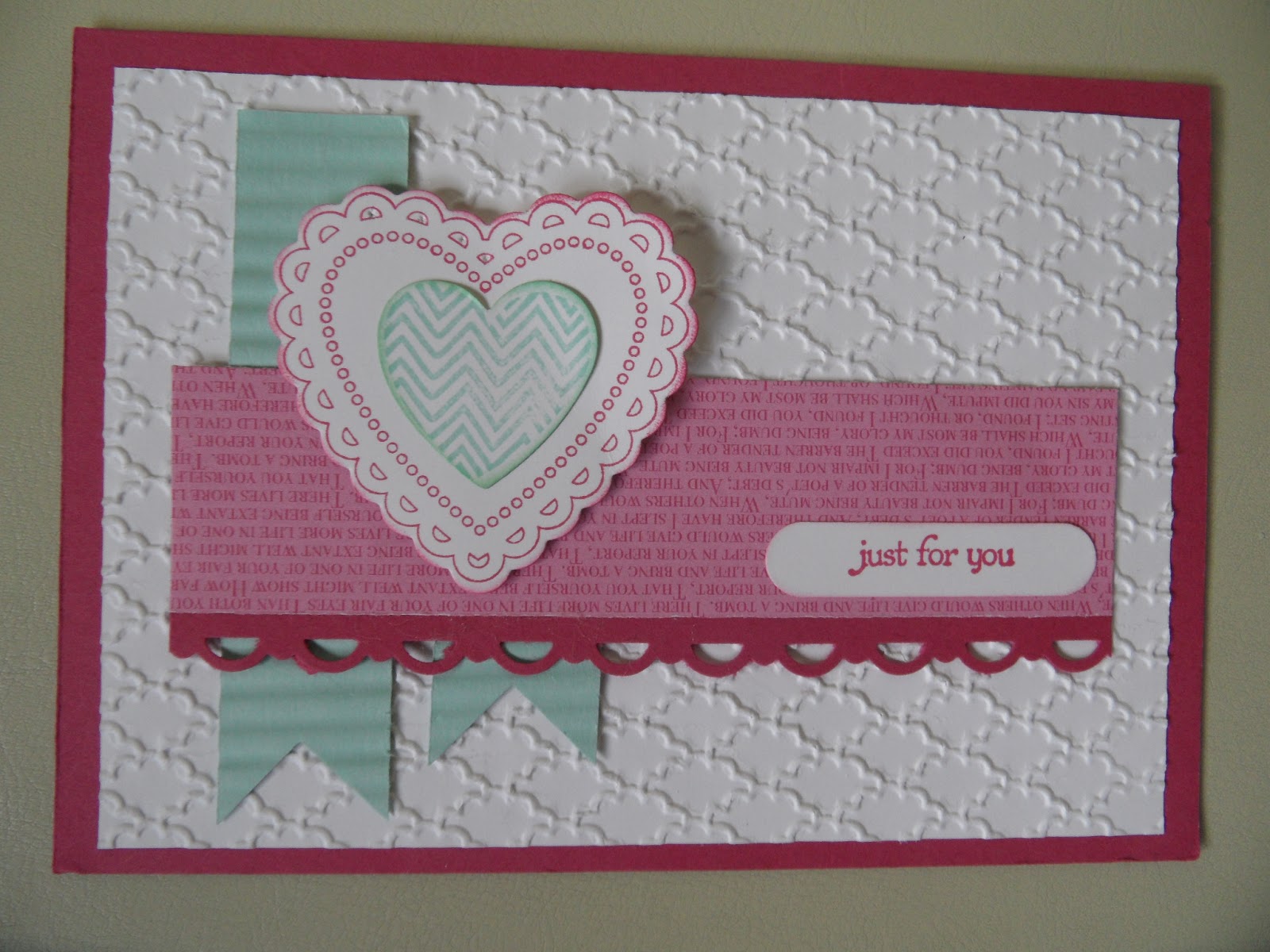The first one uses a color combination of rose red, pool party and whisper white. The lovely crinkle edged heart is from the Hearts a Flutter stamp set from the new Spring/Summer mini.