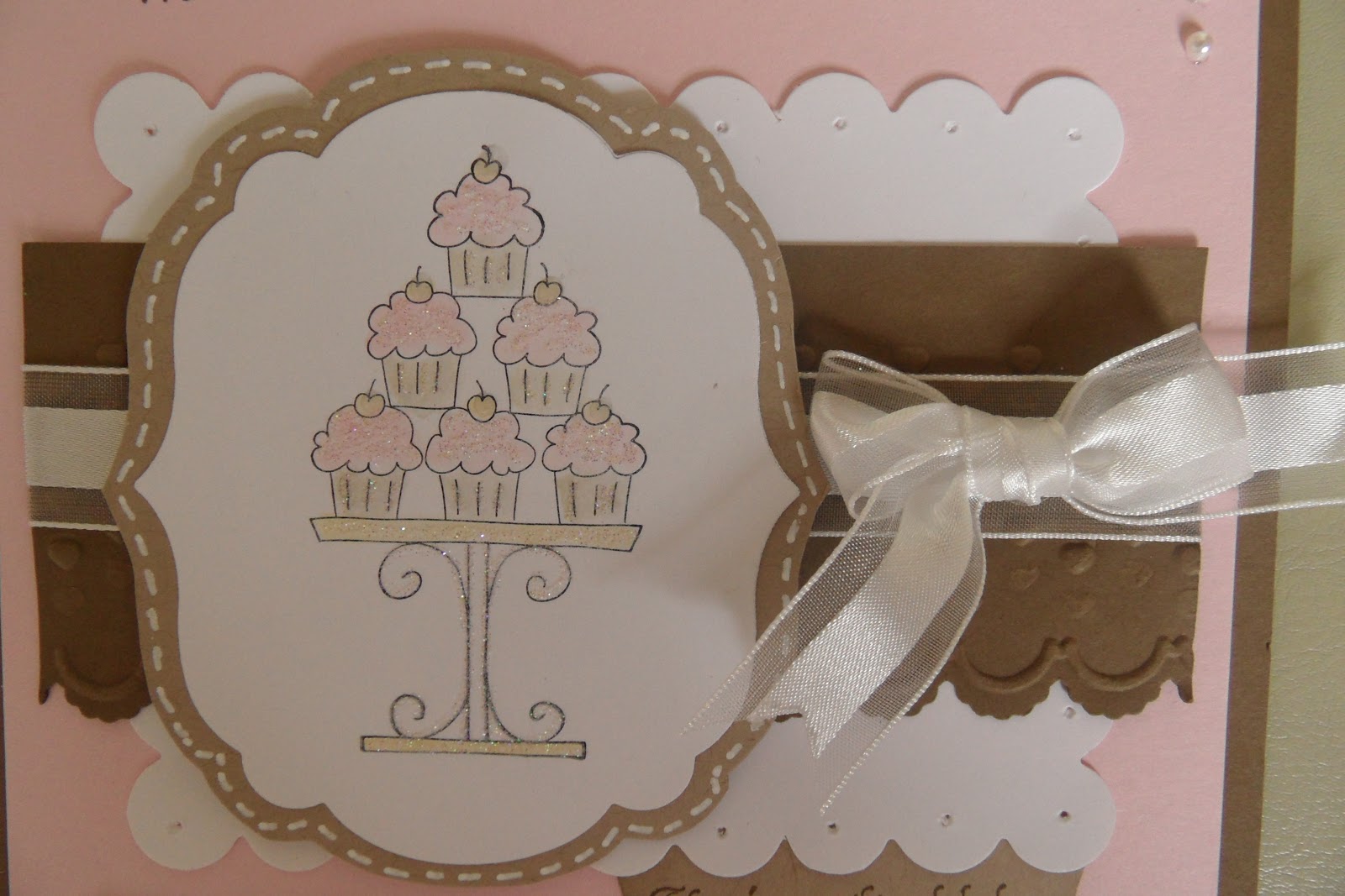 I love the Soft suede and pink pirouette colour combination. The new edgelit dies and embossing folders were used to create the centre band. The cakes and cake stand were stamped onto a framelet label and coloured with markers and dazzling diamond glitter.The white layer on the bottom was created from the scallop square Bigz die and holes were placed around the edges with the piercing tool. White organza ribbon was tied in a bow