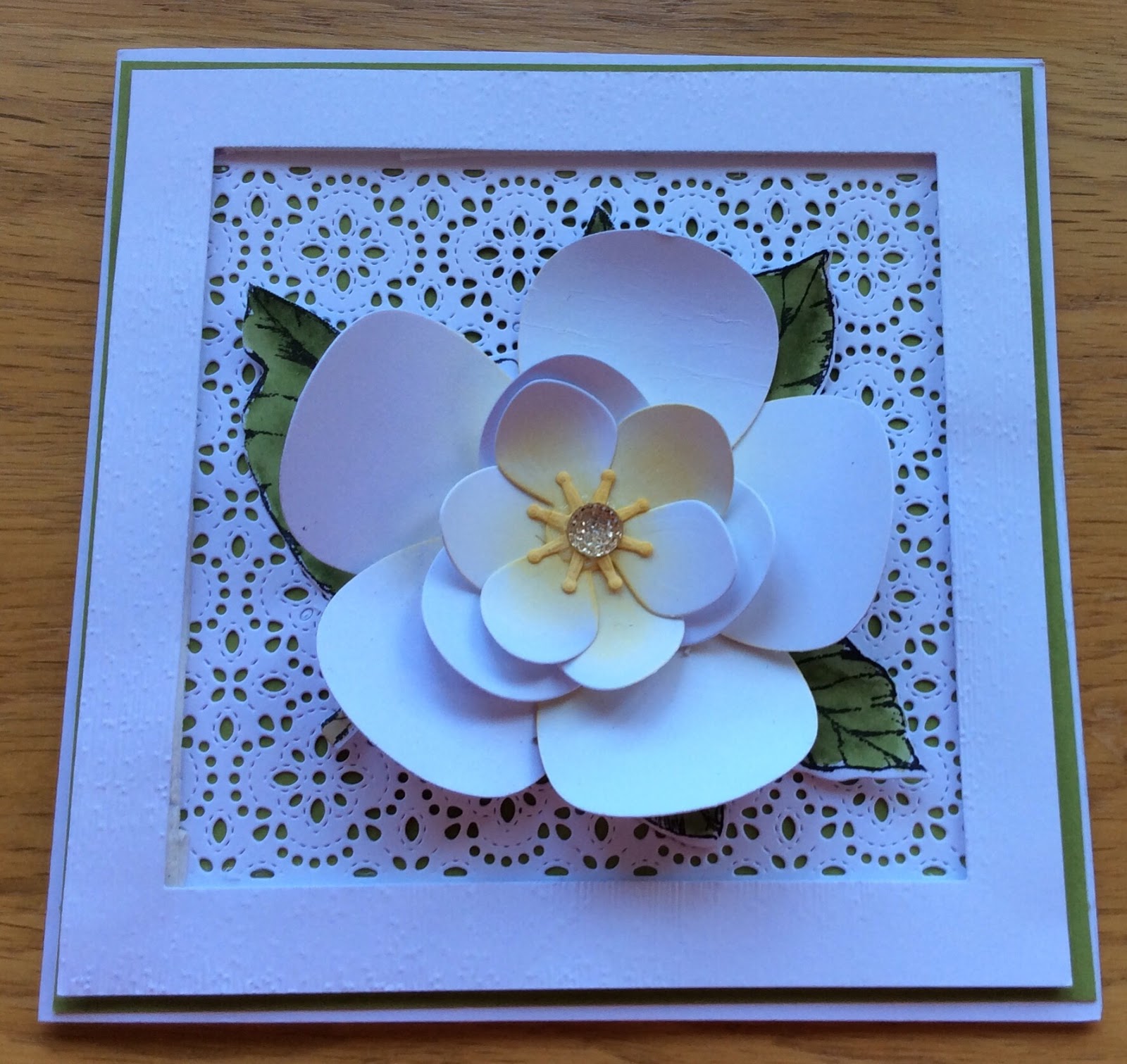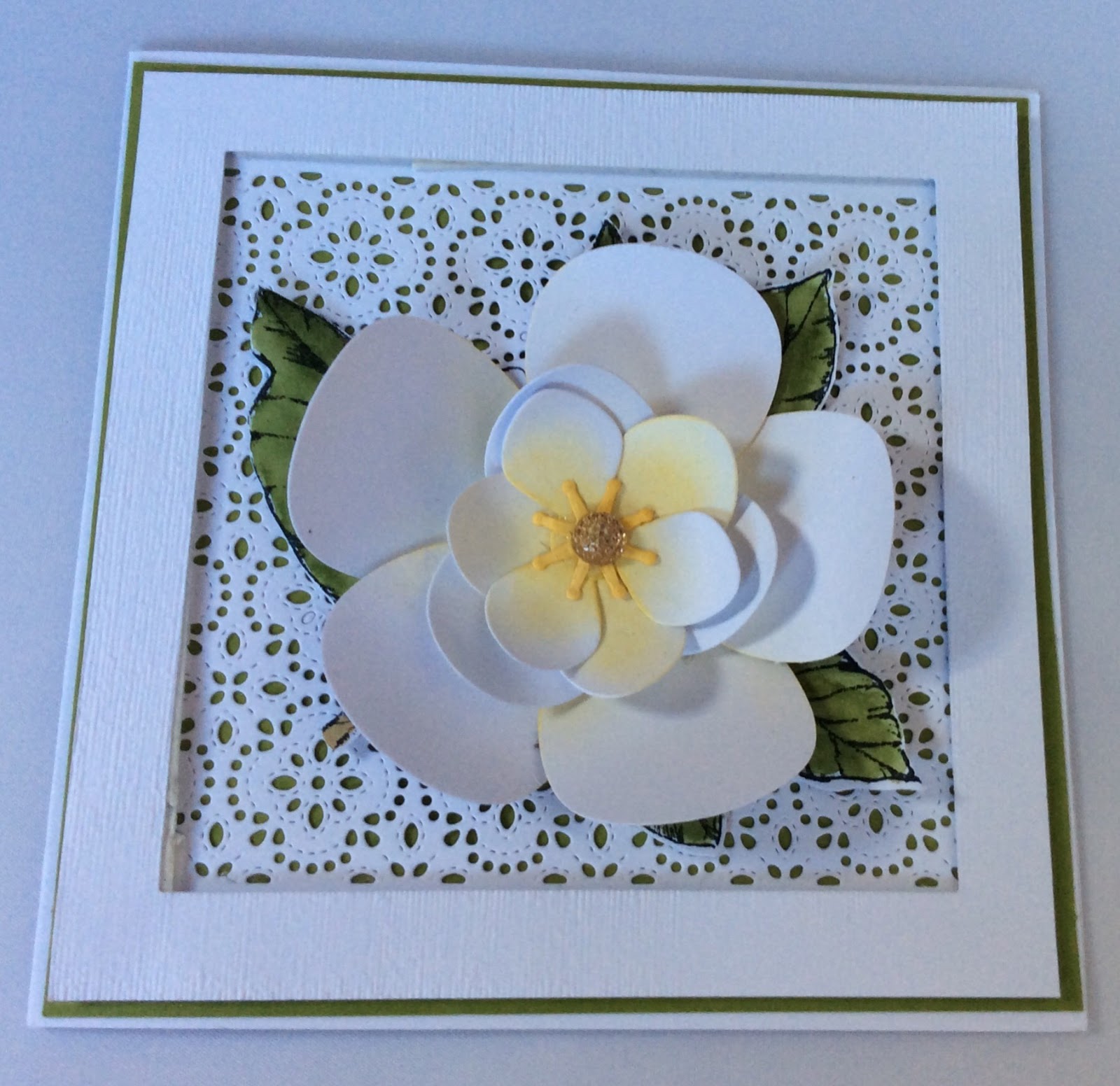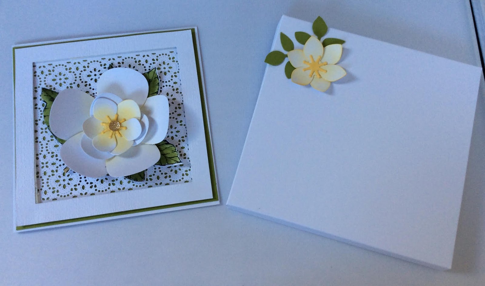 We created this stunning framed card and co-ordinating envelope box in the classes recently. The Magnolia Memory Dies were used to create the fabulous Magnolia bloom. Two small and one large