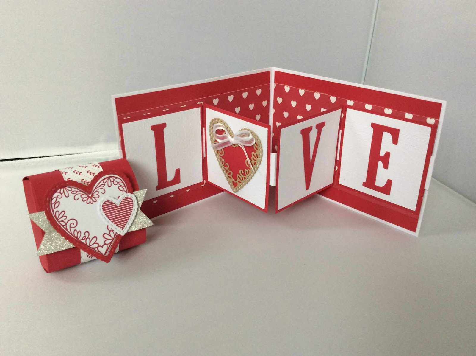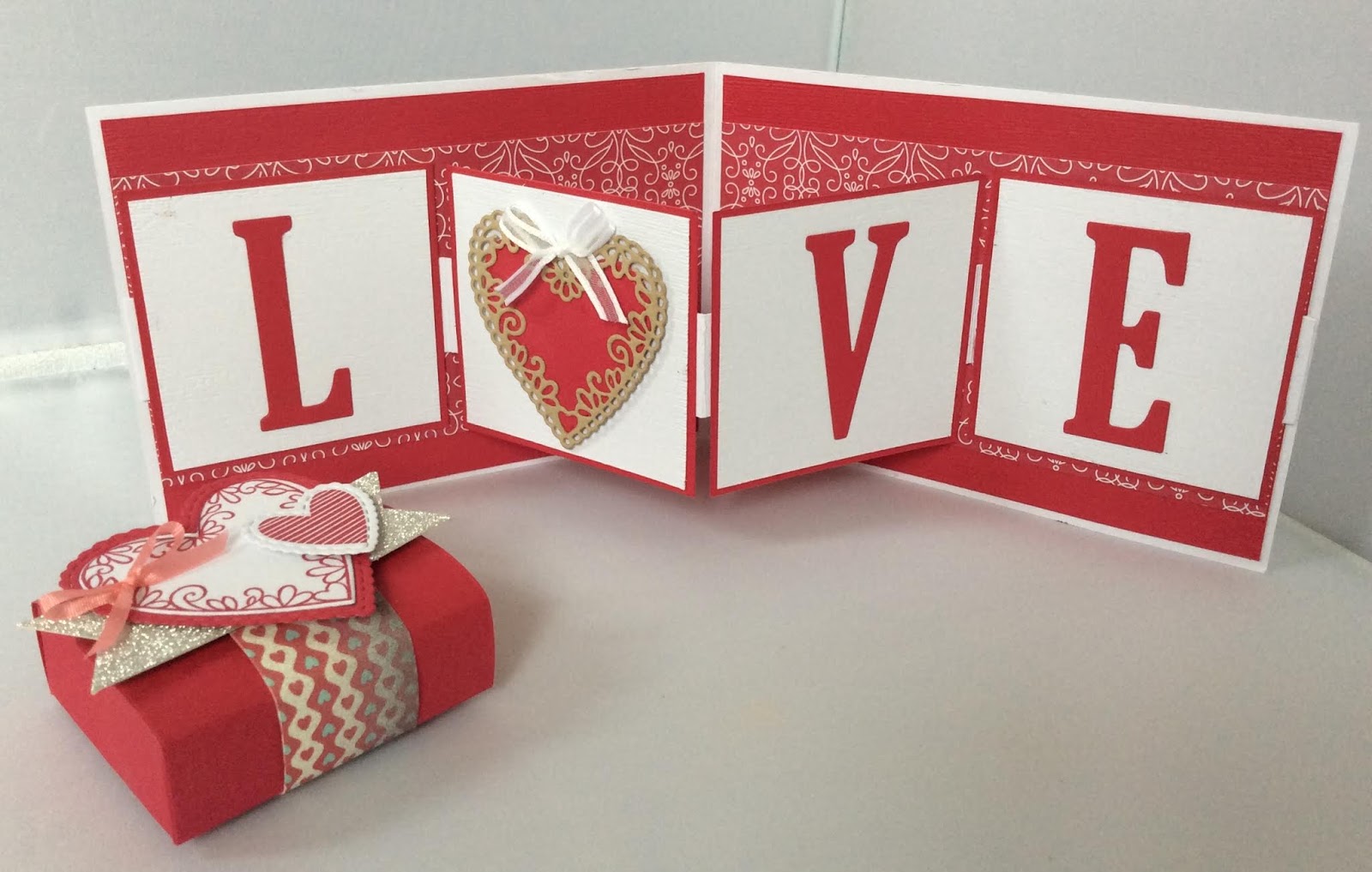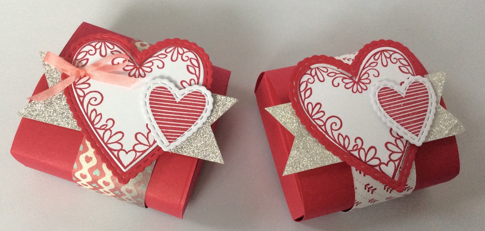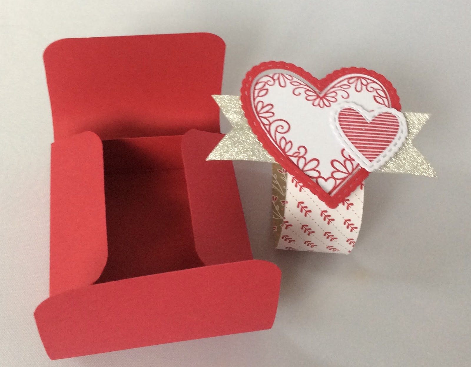 We also made a little box to match the card and placed a belly band around to close it. It is just the right size to hold a couple of chocolate hearts!!