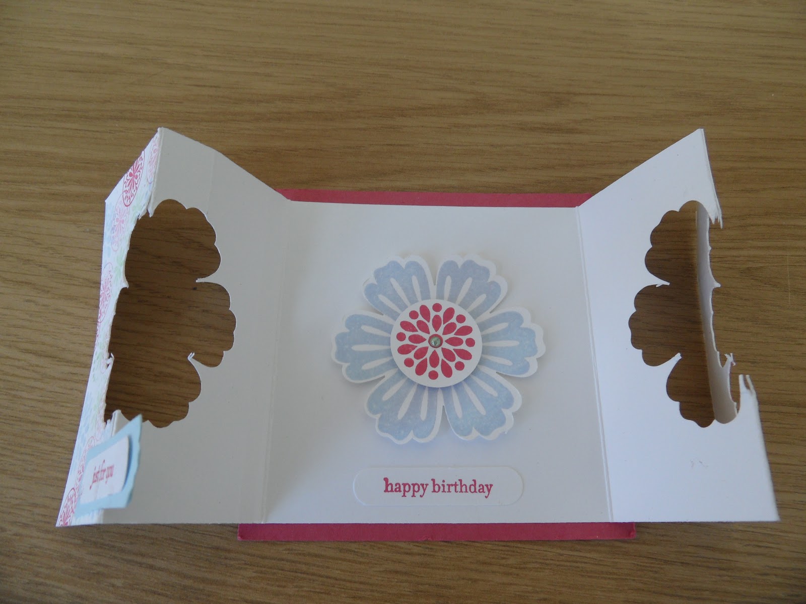 The smaller square card is a gate fold with double punched gates. Instead of opening from a fold along one edge, it opens in the middle with two sides acting like a pair of swinging gates. The front was randomly stamped using the mixed bunch stamps in real red, bashful blue and pear pizzazz colours. The two ‘gates’ were then punched each side with the blossom punch and when closed forms one cut out flower. Another flower was stamped in bashful blue placed in the middle of the cutout on the back panel