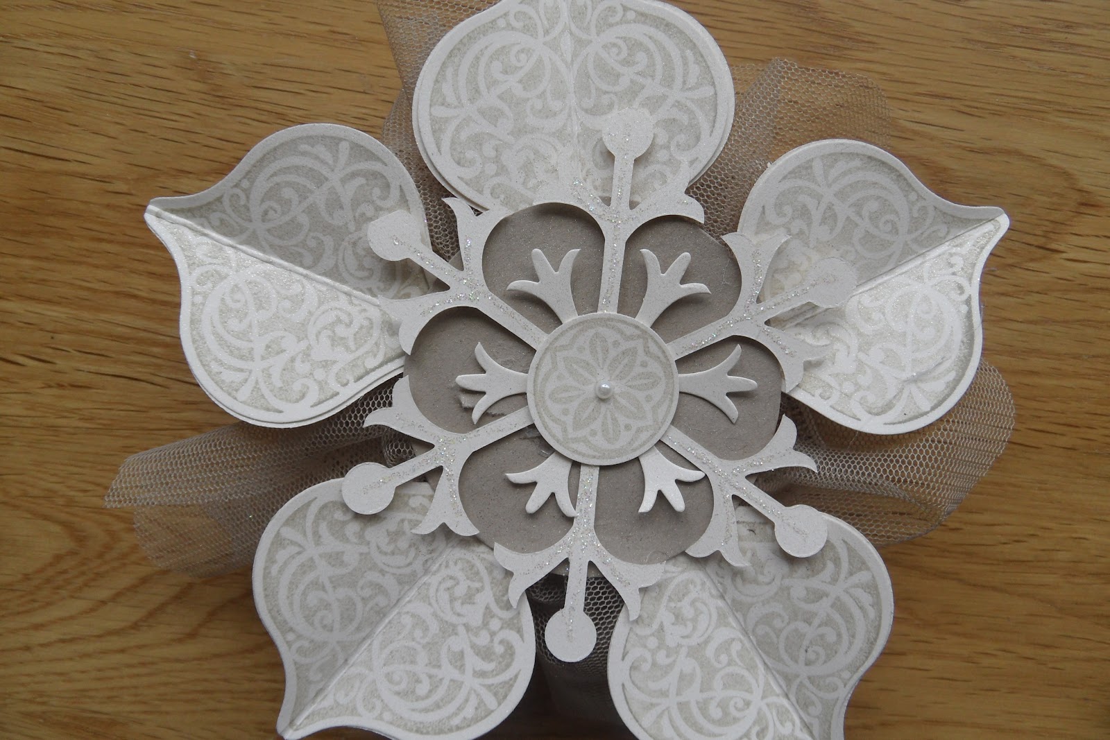 Here is my version. I have used Crumb Cake and Soft Suede colours stamped onto Very Vanilla Cardstock and cut out with the co-ordinating framelit dies. It was completed with some Crumb Cake Tulle and Snowflakes cut from the Snow Flurry Bigz Die and dazzling diamonds.