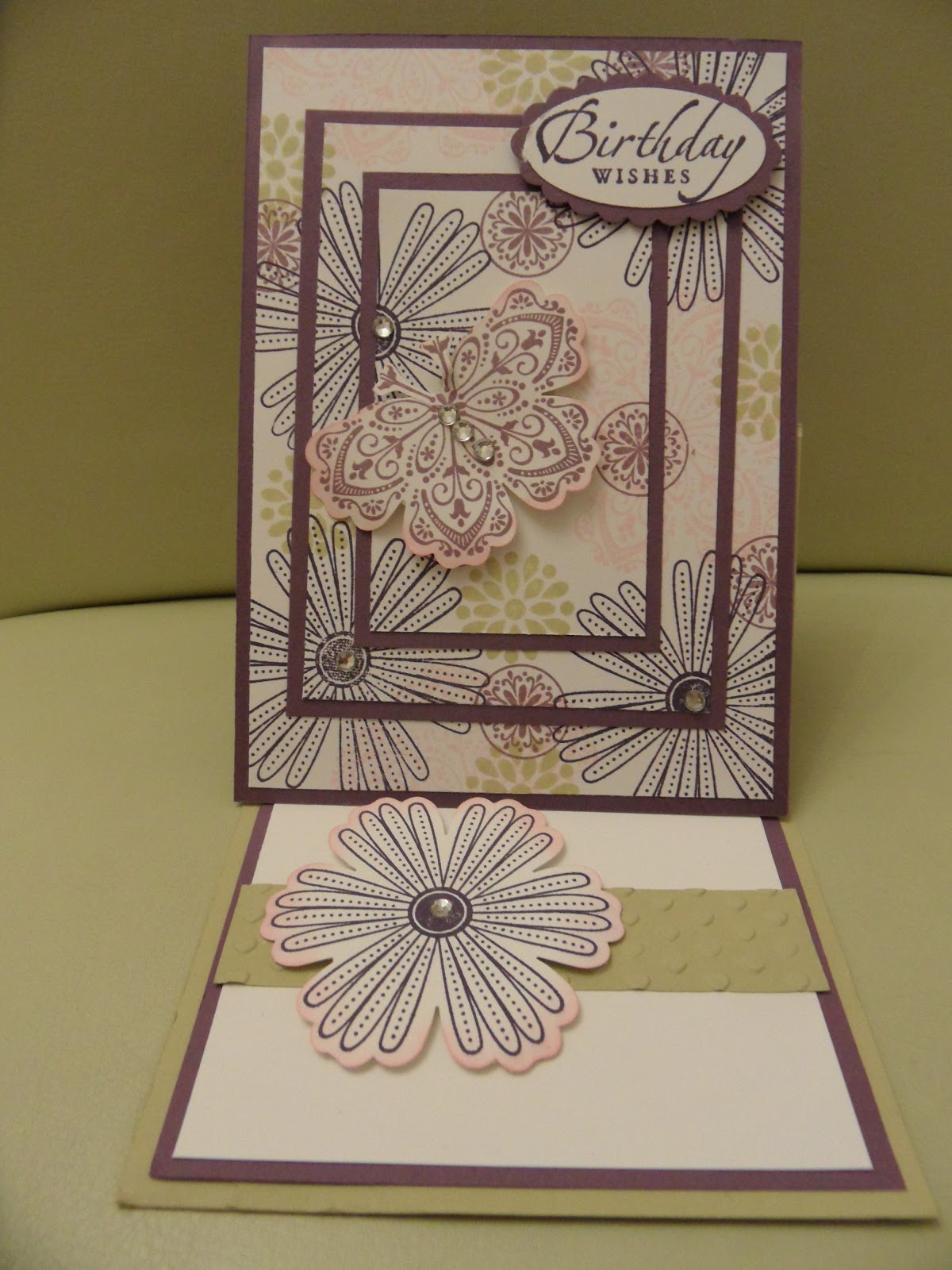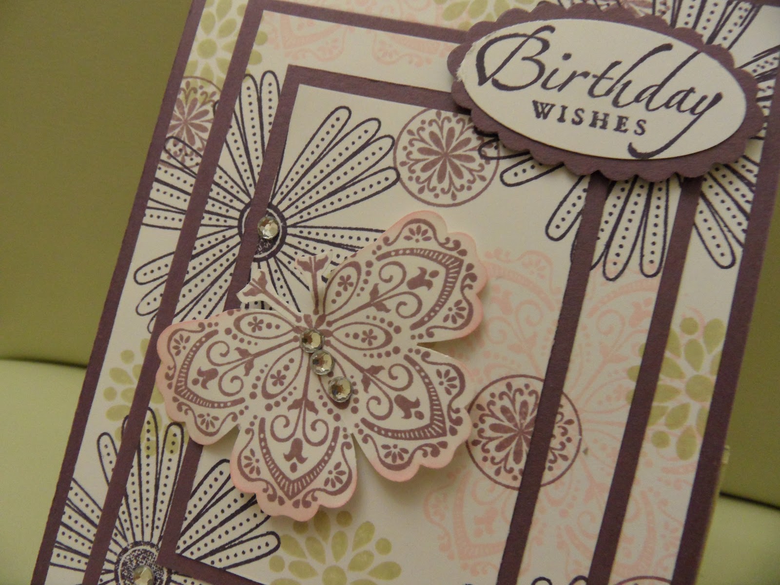The next card is a triple time stamp technique which I have seen lots of on websites recently and thought I would have a go. The colours I have used are perfect plum, elegant eggplant, river rock and pink pirouette and the stamp set is Mixed Bunch.