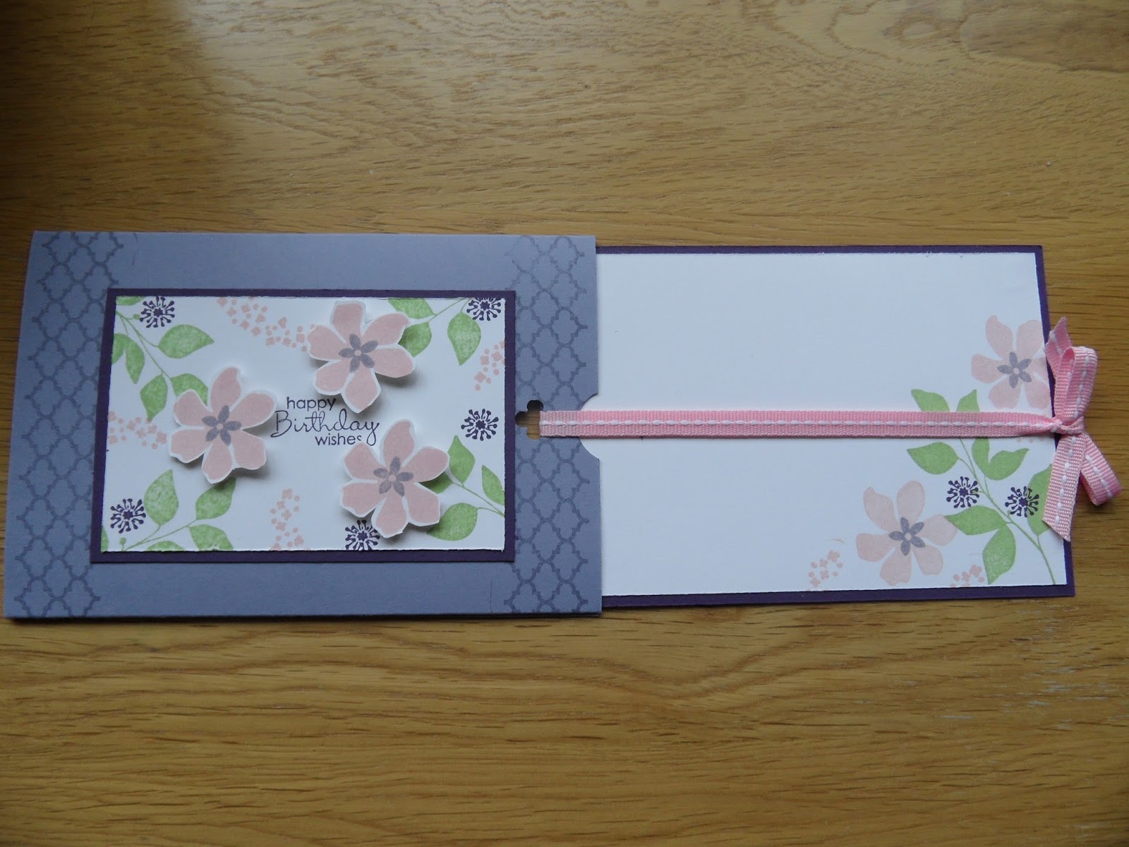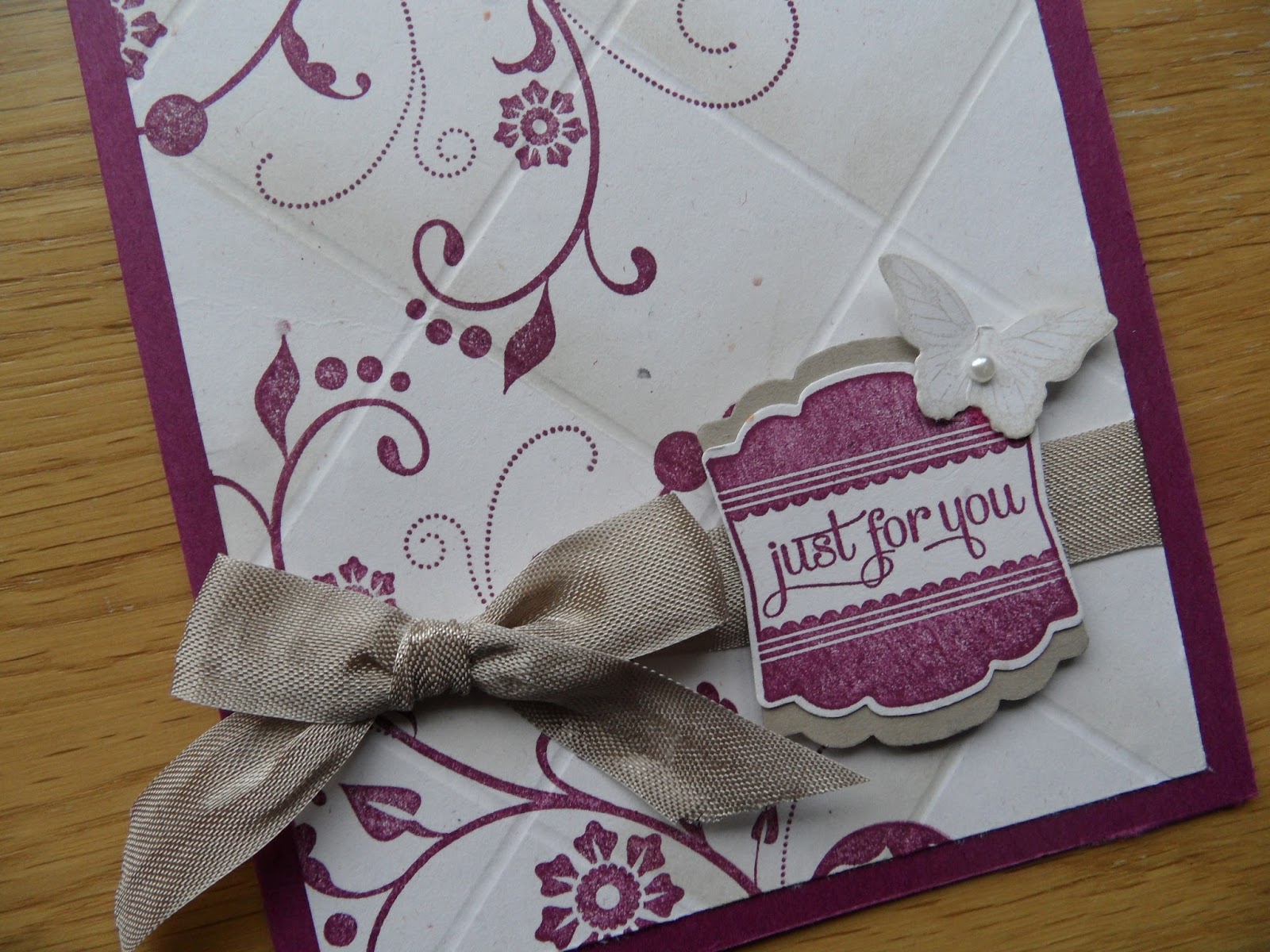 The next card was a tiled effect using flowering flourishes stamp set along with rich razzleberry and crumb cake. Every so often we like a different look to our cards and this one is easy to create and adds a fun element to your designs.