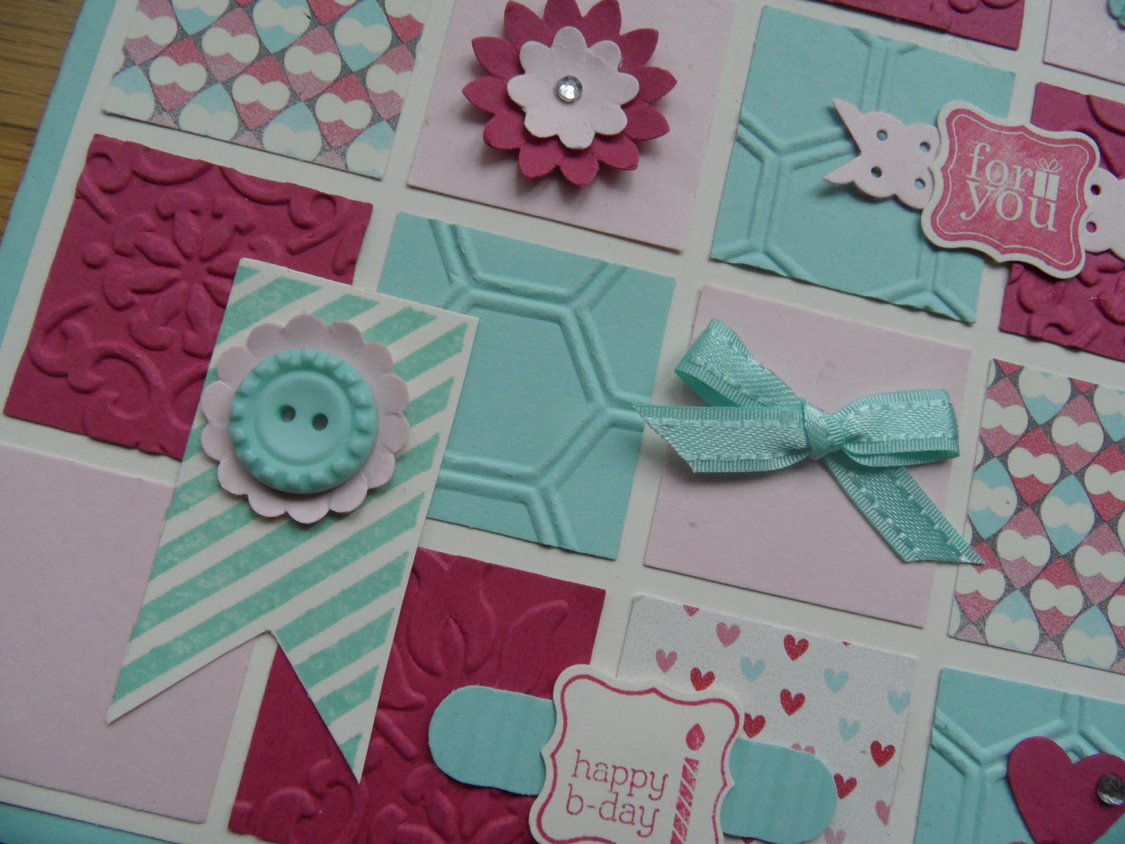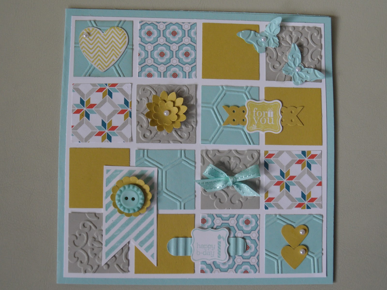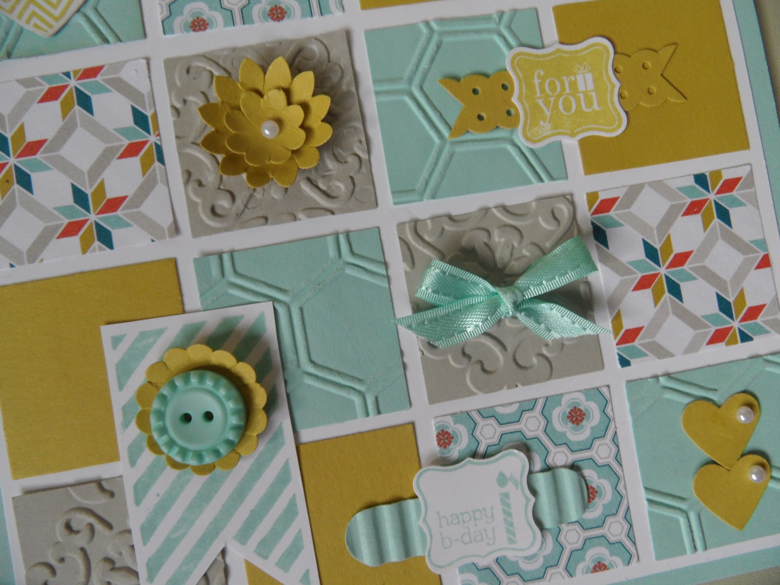 Various punches and die cuts were used along with the honeycomb and vintage wallpaper embossing folders. The 1 1/4″ square punch was used to cut the 16 squares.