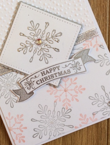 We used the snowflake sentiments stamp set from stampin up to create the following card. Half of the card was embossed with the softly falling embossing folder and the other half stamped with snowflakes using silver metallic encore ink and powder pink colour combination
