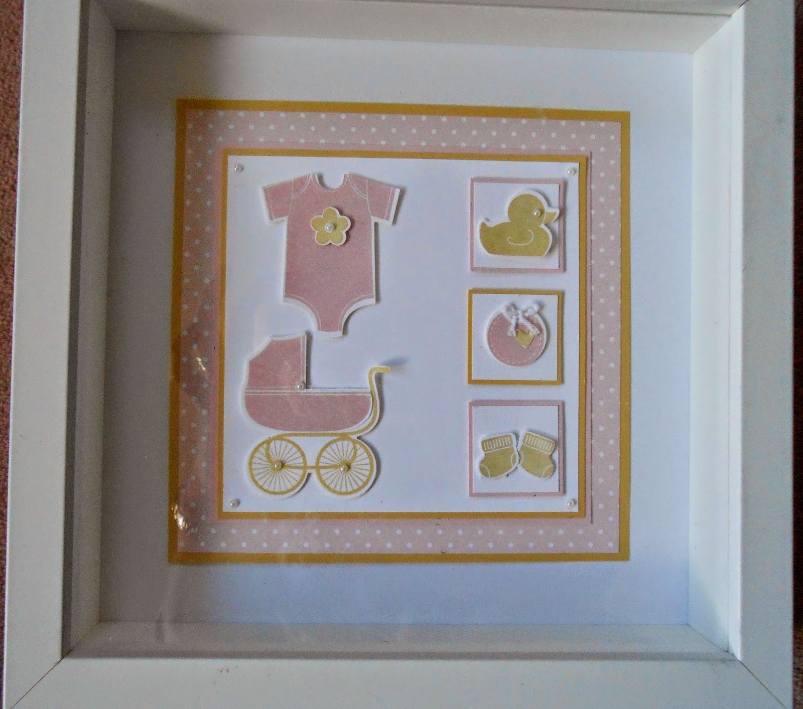 Today I am sharing a ‘baby’ theme of the box frame that we made in a recent class. The principle of a box frame is very versatile and can be used to showcase delicate items or 3D decoupage, which is then protected by the glass.