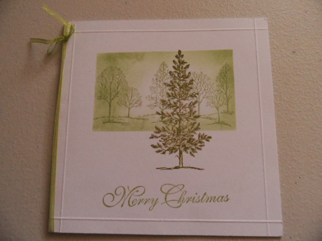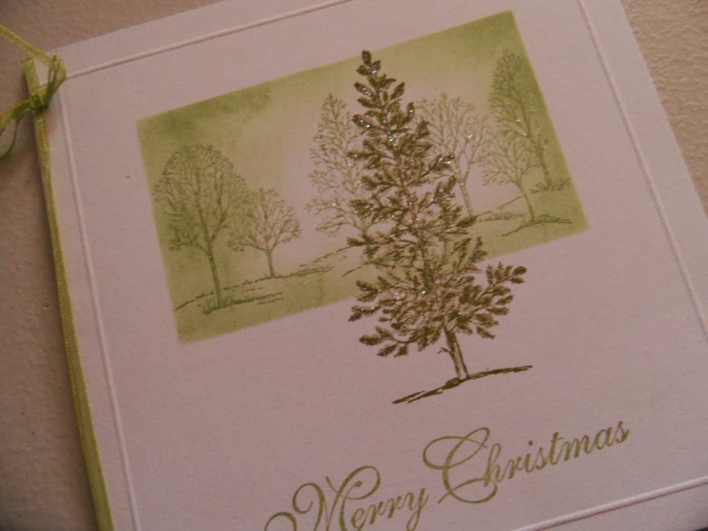 background was created very quickly and easily using a mask and sponged with pear pizazz ink. The lovely as a Tree stamp was stamped over the top in the same colour ink, to give the