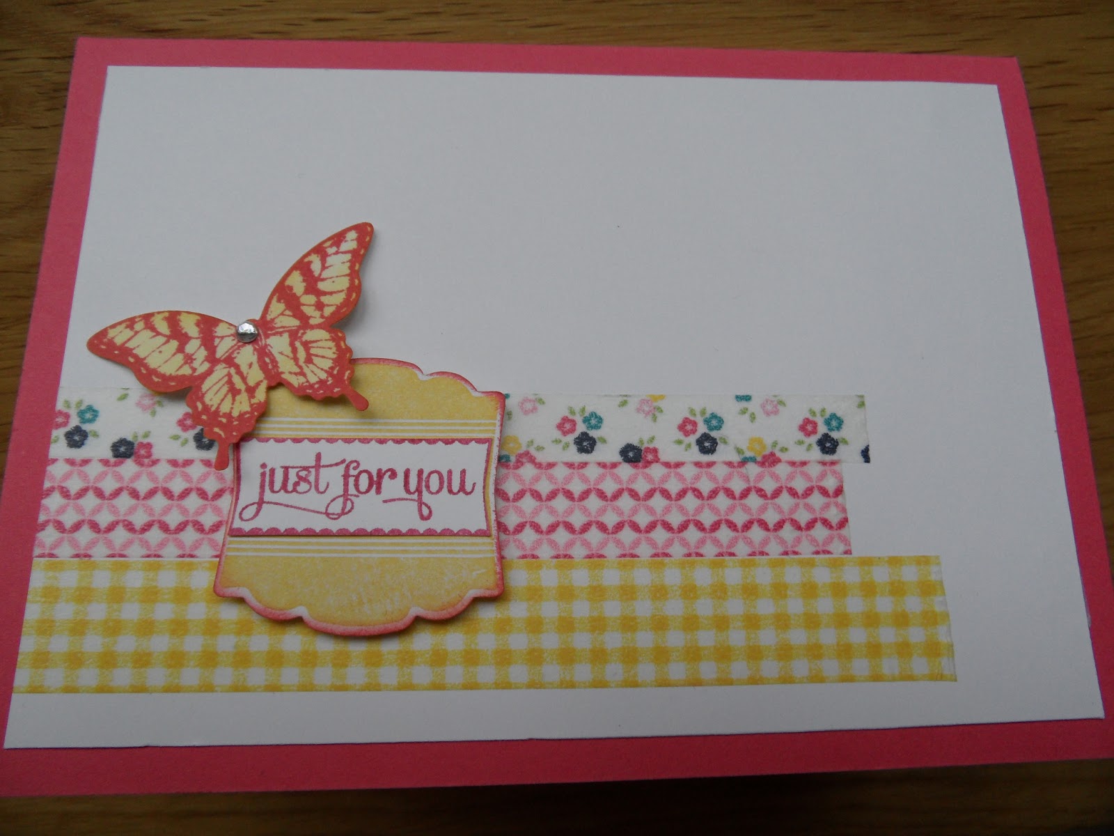 One of the make and take cards using the new gingham garden washi tape and Label Love Stamp set and matching punch. Colours used Daffodil Delight and one of the new in-colours Strawberry Slush.