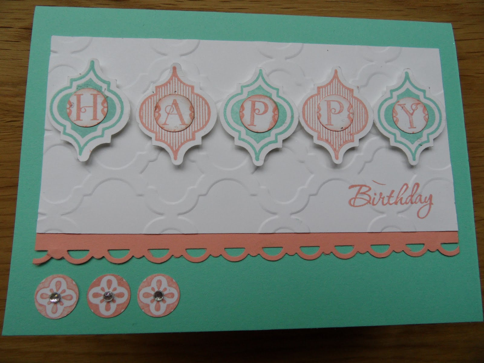The ‘HAPPY’ letters were stamped separately using the occasions alphabet set and punching a 1/2″ circle. Colour combination is Coastal Cabana and Crisp Cantaloupe.