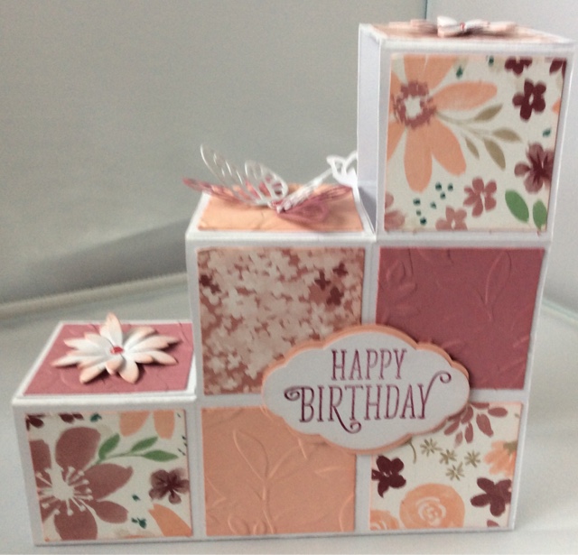 It looks complicated but is created from two sheets of card measuring 15cm x 25cm and scored at 5 cm intervals and with a couple of cut outs, fit together to form the steps. There are lots of tutorials on the internet with more detailed instructions