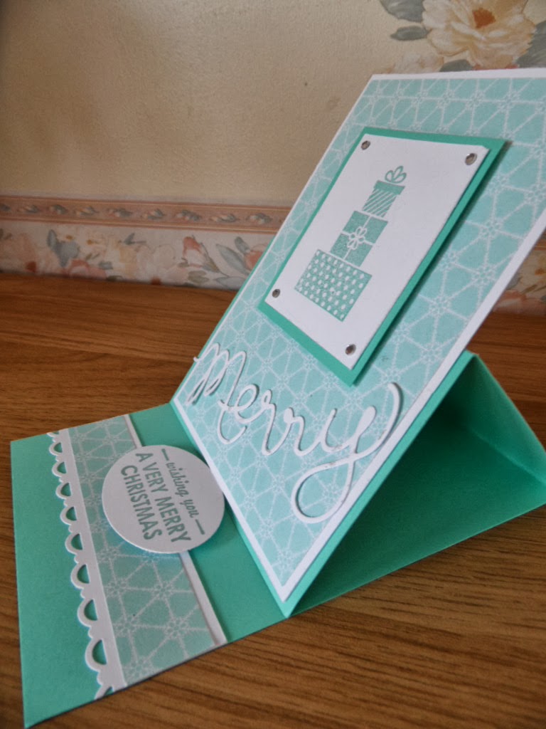 An easel card using a piece of the winter frost designer series paper stack and one of the new expression thinlit dies from the Autumn/Winter mini catalogue. There are three dies in the set, Merry, Love and Thankful, priced at £22.95