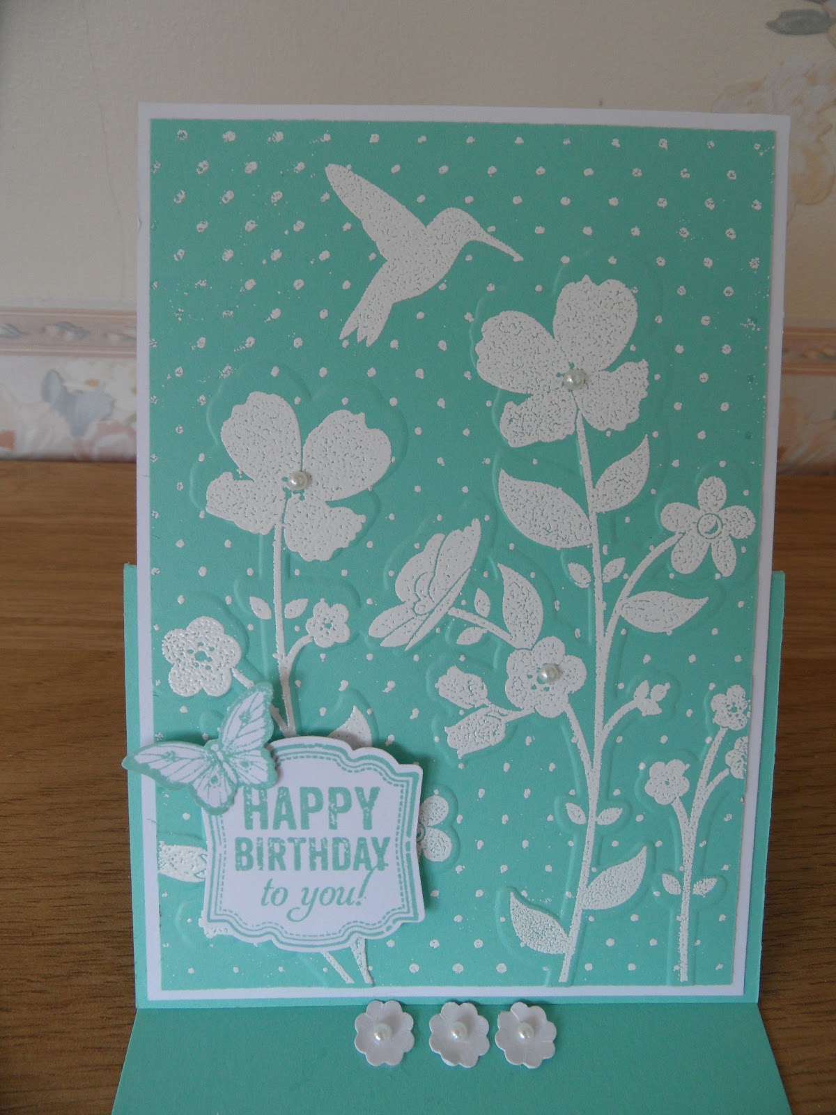 As you can see from my last few posts I absolutely love the wildflower meadow stamp set and co-ordinating embossing folder.  Although it is a huge stamp, it is so easy to use, versatile and can make beautiful cards in no time at all. We all like those cards that are quick to make and look very effective