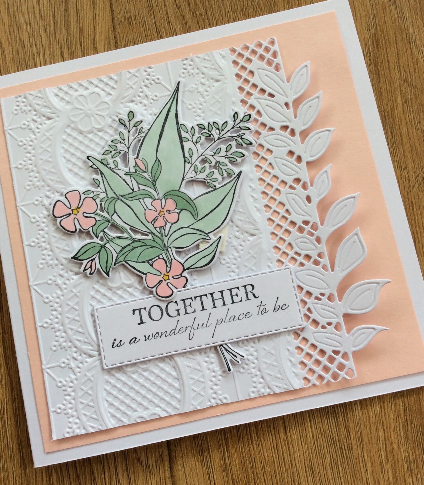 I teamed the Wonderful Romance bundle with the lace dynamic textured embossing folder and one of the stitched rectangle framelit dies for the sentiment. The image was stamped in Black Memento ink and coloured in with soft sea foam and flirty flamingo blends.