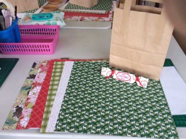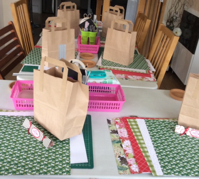 The table all set up for the workshop with the pack of Under the mistletoe DSP, goodie bag and a little handmade cracker gift for everyone.